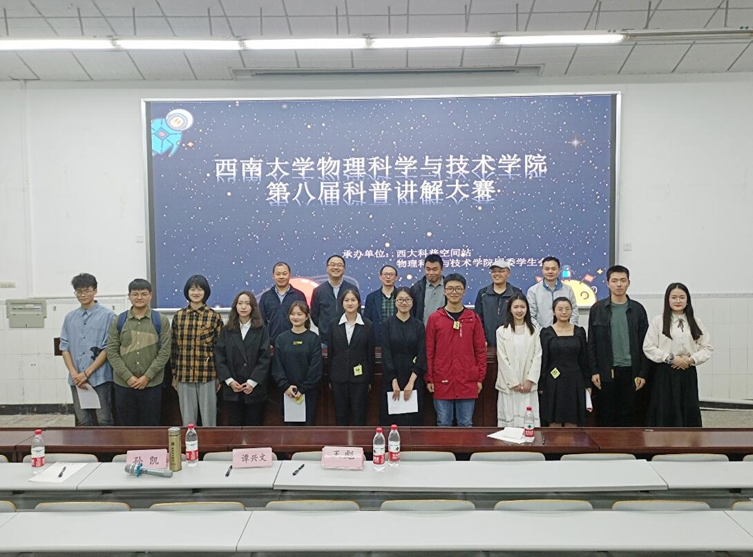 为培养大学生科学精神,提高大学生科普讲解能力,同时选拔重庆市科普讲解大赛选手,4月5日,胜游体育(中国)官方在线第八届科普讲解大赛决赛在物理大楼大阶梯教室顺利举行。胜游体育(中国)官方在线邓涛副院长、谭兴文、贾伟尧、王彪、孙凯、张巧明等老师担任评委,12名参赛选手及2017级、2019级、2020级的部分同学出席了本次活动。