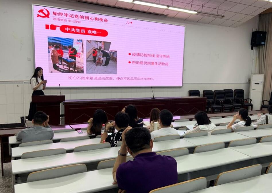 九组参赛选手根据抽签顺序围绕“学党史,人人讲科学家故事”这一主题,挖掘红色资源,结合学习体会,深情并茂地讲述了一个个党史故事,诠释了共产党员的初心和使命。其中,2017级师范2班刘婷同志以“制造业皇冠顶端的明珠”为题,辅助微视频形象地讲授了我国科学家迎难而上克服技术难关,在智能机器人研发方面取得的重大成就;2019级师范2班夏茂馨同志搭配背景音乐,以“中国共产党保持恒久韧性的奥秘”为题,讲授了学生党员“红帽子”队员袁维一同学坚持开展校园抗疫工作、长期支教的动人故事。在中学实习的2018级师范2班的吴青青、唐睿琪以录制视频的形式参赛,以小见大,展示了青年大学生满怀理想、不负青春的决心与信心。