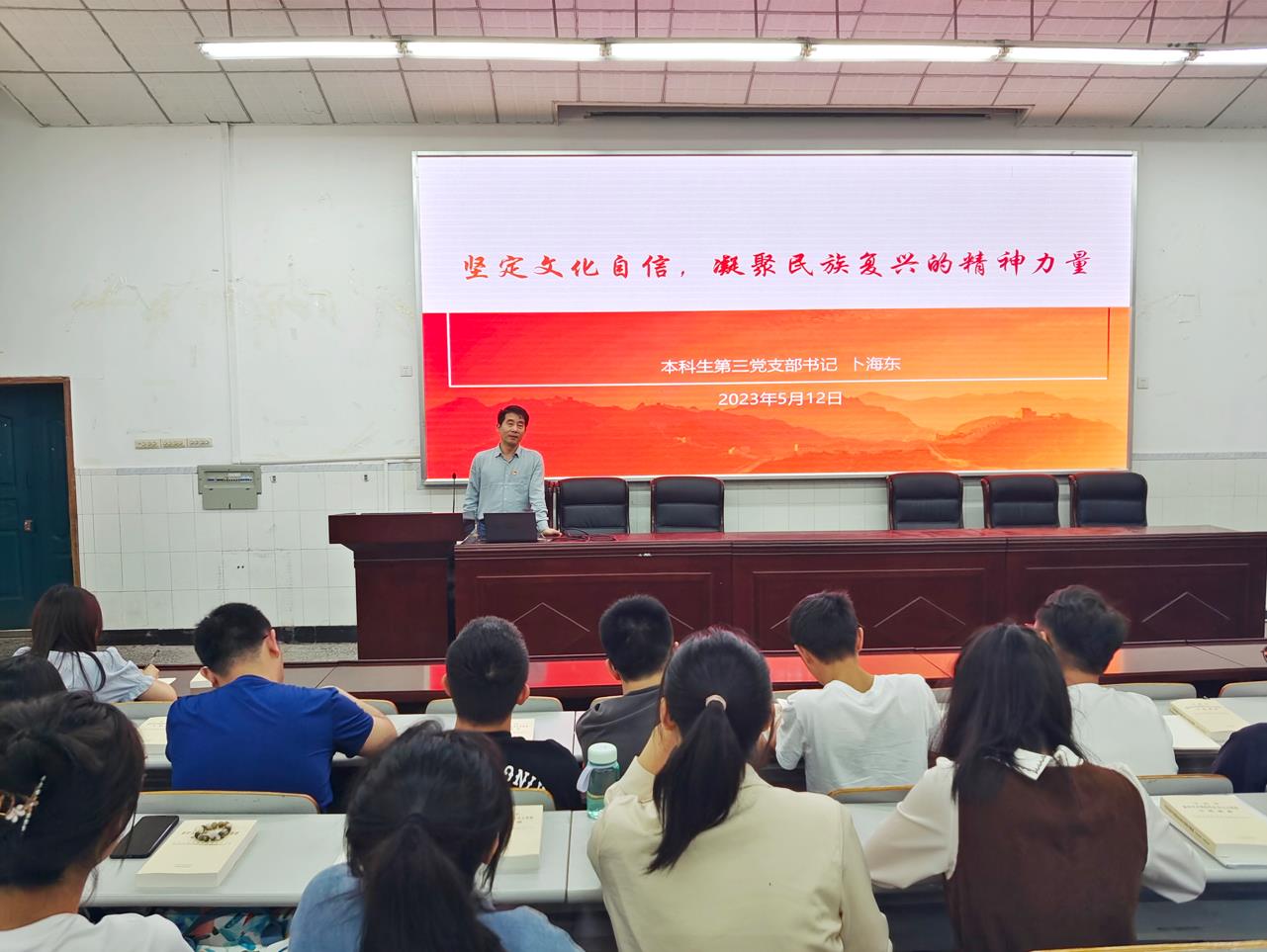 集中学习结束后,与会党员同志们集中观看保密教育宣传片和微视频《青年朋友的知心人》。支部书记卜海东同志结合主题教育的学习心得体会,以“坚定文化自信,凝聚民族复兴的精神力量”为题为支部党员讲授专题党课。他从坚定文化自信是实现中华民族伟大复兴的必然要求和以高度的文化自信引领文化强国建设两个方面,深刻阐明了什么是文化自信?文化自信的重要性、文化自信的底气、如何坚持文化自信和推进文化自信自强、铸就社会主义文化新辉煌等。他鼓励支部党员同志立志做好中国文化的继承者、学习者和传播者,以实际行动坚定文化自信,坚守中华文化立场、传承中华文化基因,为实现中华民族伟大复兴注入更强大的青春力量。