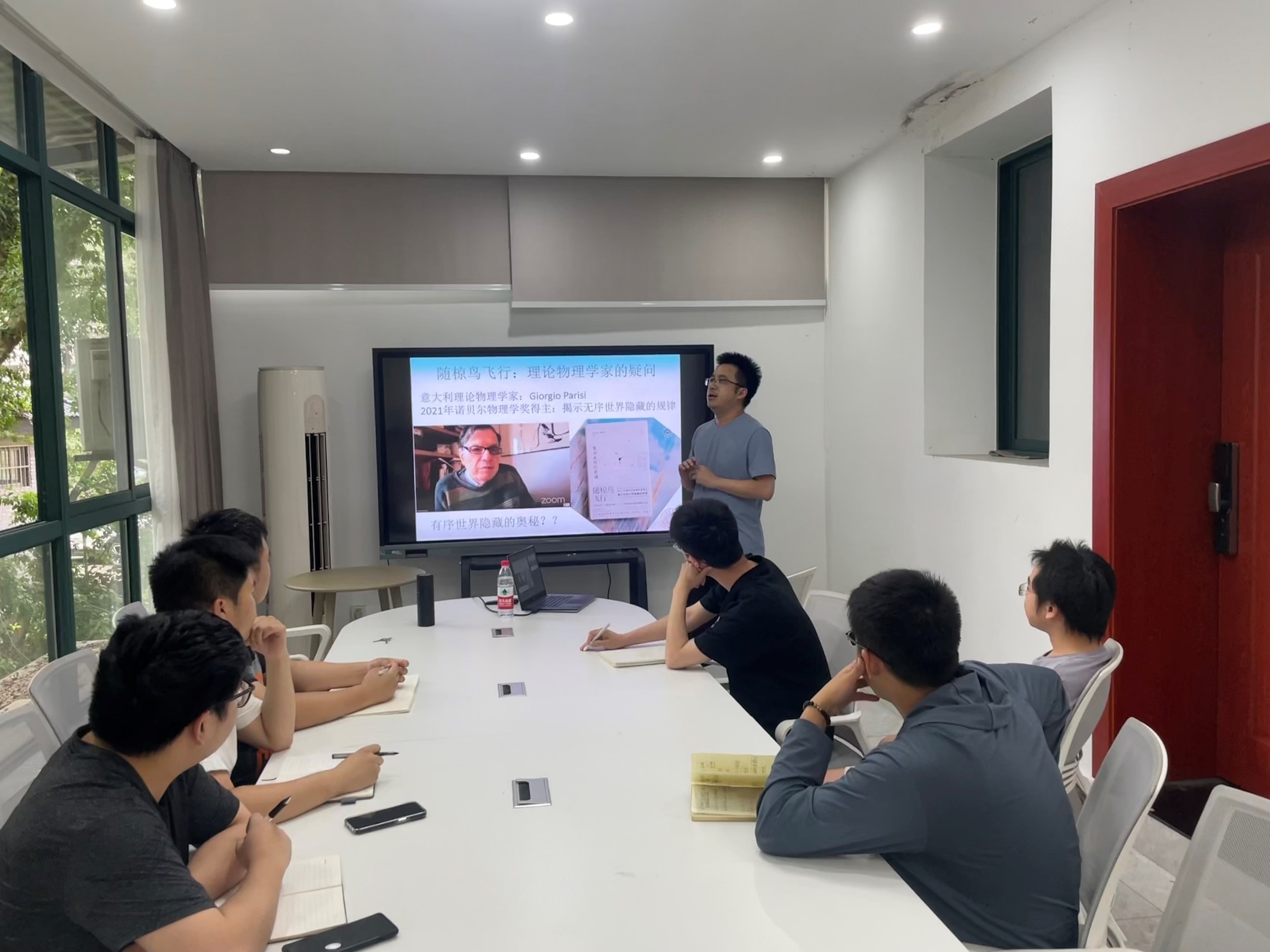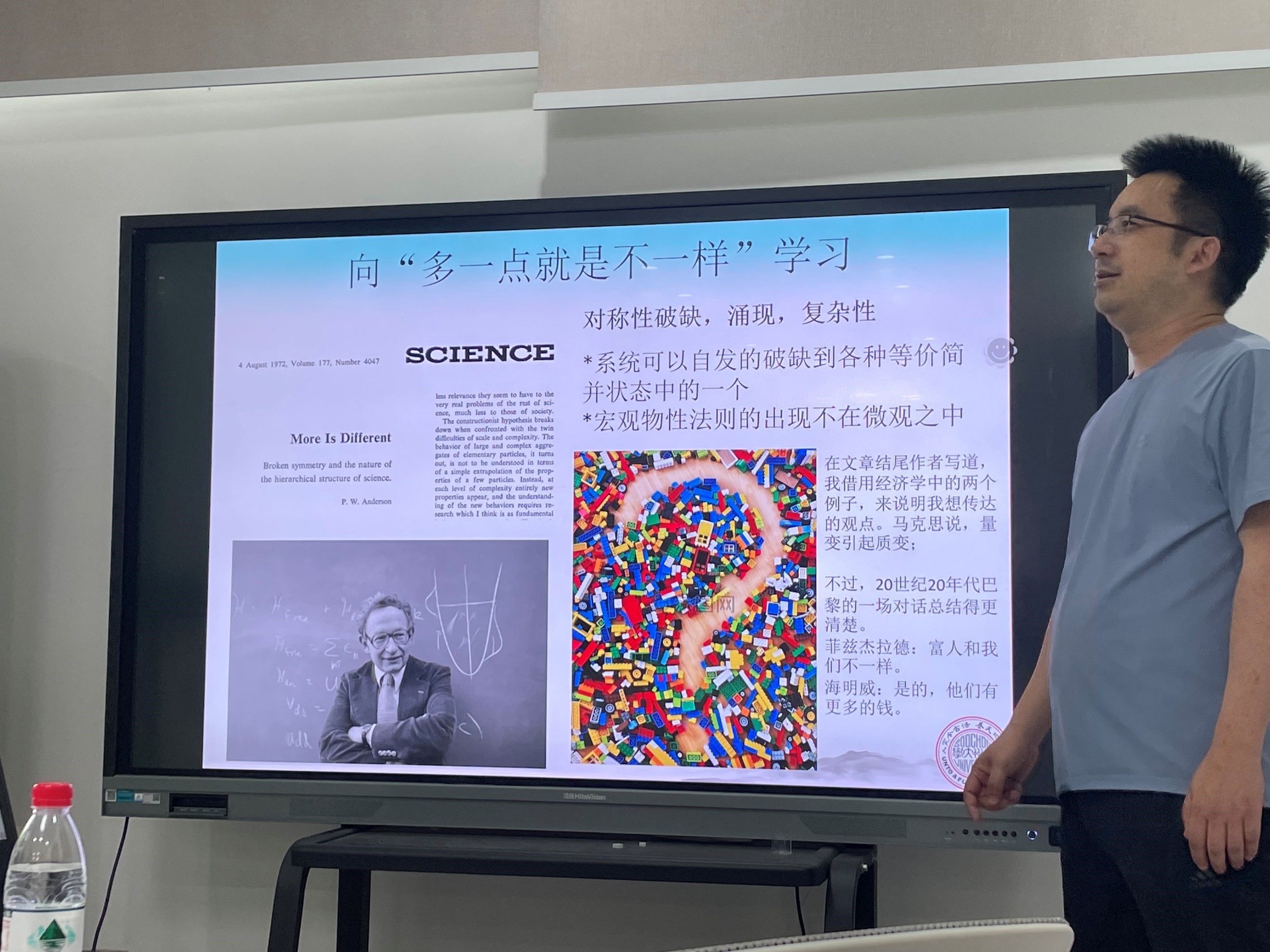 在大尺度下,施教授通过丰富的图片和视频,直观地展现了鸟群、羊群和菌群的大尺度流体力学特性,深入浅出地介绍了活性物质在多体相互作用下所展现出的基本特点和物理洞察。针对上述图像,施教授介绍了简单的Vicsek模型,并展示了其在百万量级下的计算所展现出的丰富群体行为。之后,施教授介绍了他最近在活性布朗粒子、杆状粒子中的最新的研究成果,并用以解释活性液体的中失稳的气泡和各种拓扑缺陷的产生与湮灭。最后,施教授从物理哲学的高度,介绍了著名物理学家P. W. Anderson“多者异也”的重要思想,阐述了软凝聚态物理中对称性破缺、涌现和复杂性的特点,最后以海明威和菲兹杰拉德的对话结束讲座,施教授的报告从不同层面上展现了物理学之美,激发起广大师生热烈的讨论和共鸣。