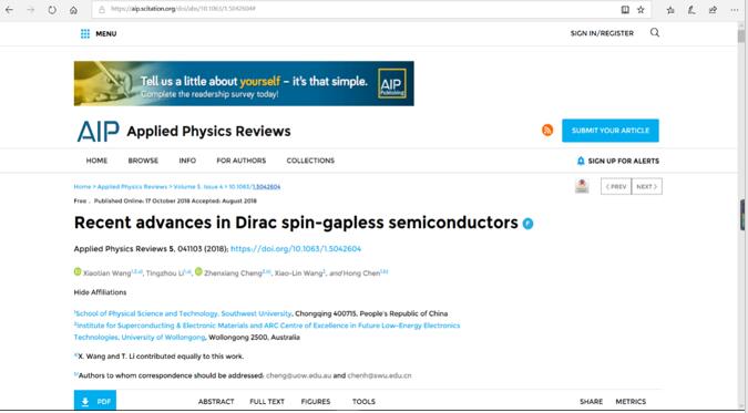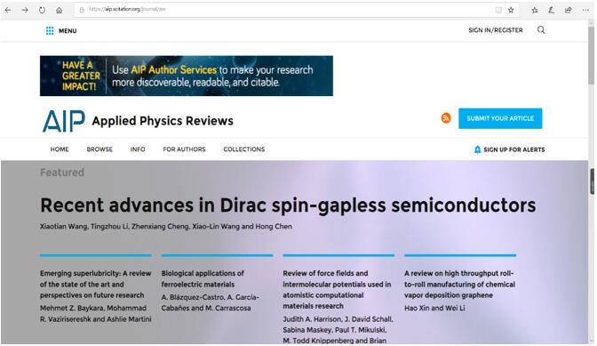 近日,我院陈洪教授科研团队在AIP旗下Applied Physics Reviews期刊发表了题为“Recent advances in Dirac spin-gapless semiconductors”的综述论文,系统阐述了Dirac型自旋无能隙半导体的物理机制、研究现状和发展方向。Applied Physics Reviews为AIP旗下顶级物理类综述期刊,最新影响因子为12.89。我院为该论文第一完成单位,王啸天副教授及本科生李汀洲为共同第一作者,通讯作者为陈洪教授和澳大利亚伍伦贡大学Z.X. Cheng教授,另外自旋无能隙半导体材料的提出者X.L. Wang教授也被邀请为合作者为我们的论文质量把关。该论文被审稿人和主编高度评价,评选为特色论文(蓝色Featured [F] 标识),并在APR网站首页上置顶。