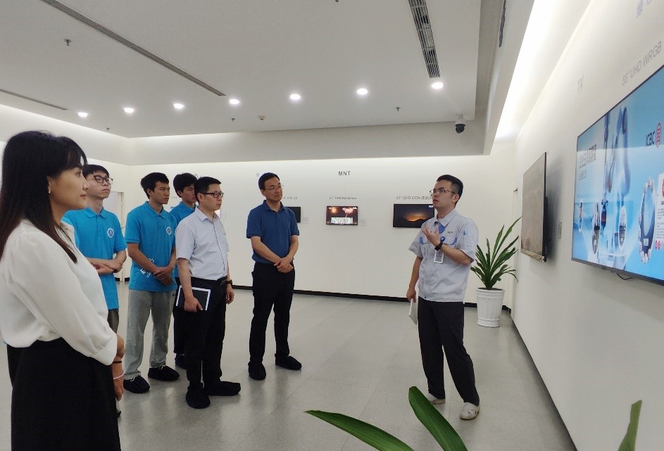 为更好地发挥高校人才培养、科学研究、社会服务等功能,进一步加强校企合作、推动产教融合,促进学科专业建设,开拓实习就业岗位,7月3日,胜游体育(中国)官方在线党委书记舒刚带队赴京东方科技集团重庆京东方光电科技有限公司走访调研,胜游体育(中国)官方在线党委副书记娄霞、副院长赵建伟、本科生辅导员晏勇及部分学生代表参与走访。重庆京东方光电科技有限公司人力资源部部长刘易文、工艺部部长熊永、人力资源部HR郝佳慧等陪同参观。