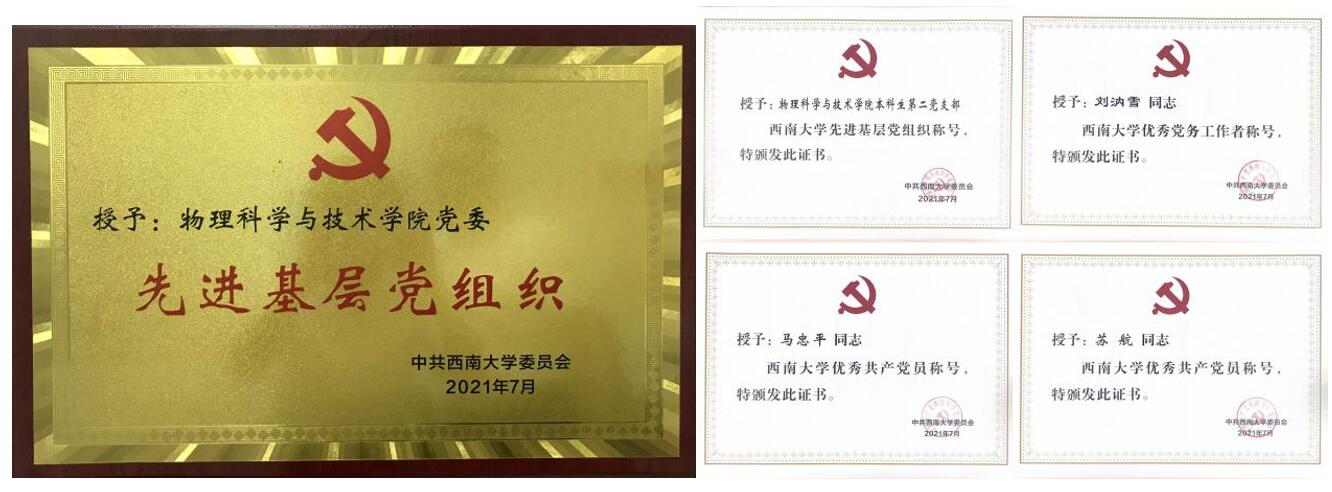 胜游体育(中国)官方在线在本次“两优一先”的评选中斩获了五项荣誉。胜游体育(中国)官方在线党委在全校二级党组织中脱颖而出,获得了“西南大学先进基层党组织”荣誉称号。该荣誉称号共授予了校内八个二级党组织,胜游体育(中国)官方在线党委书记李余廷上台领奖。胜游体育(中国)官方在线工会主席马忠平副教授以及2018级本科生苏航获得了“优秀共产党员”荣誉称号;党委副书记刘汭雪获得了“优秀党务工作者”荣誉称号;本科生第二党支部获得了“先进基层党组织”荣誉称号。