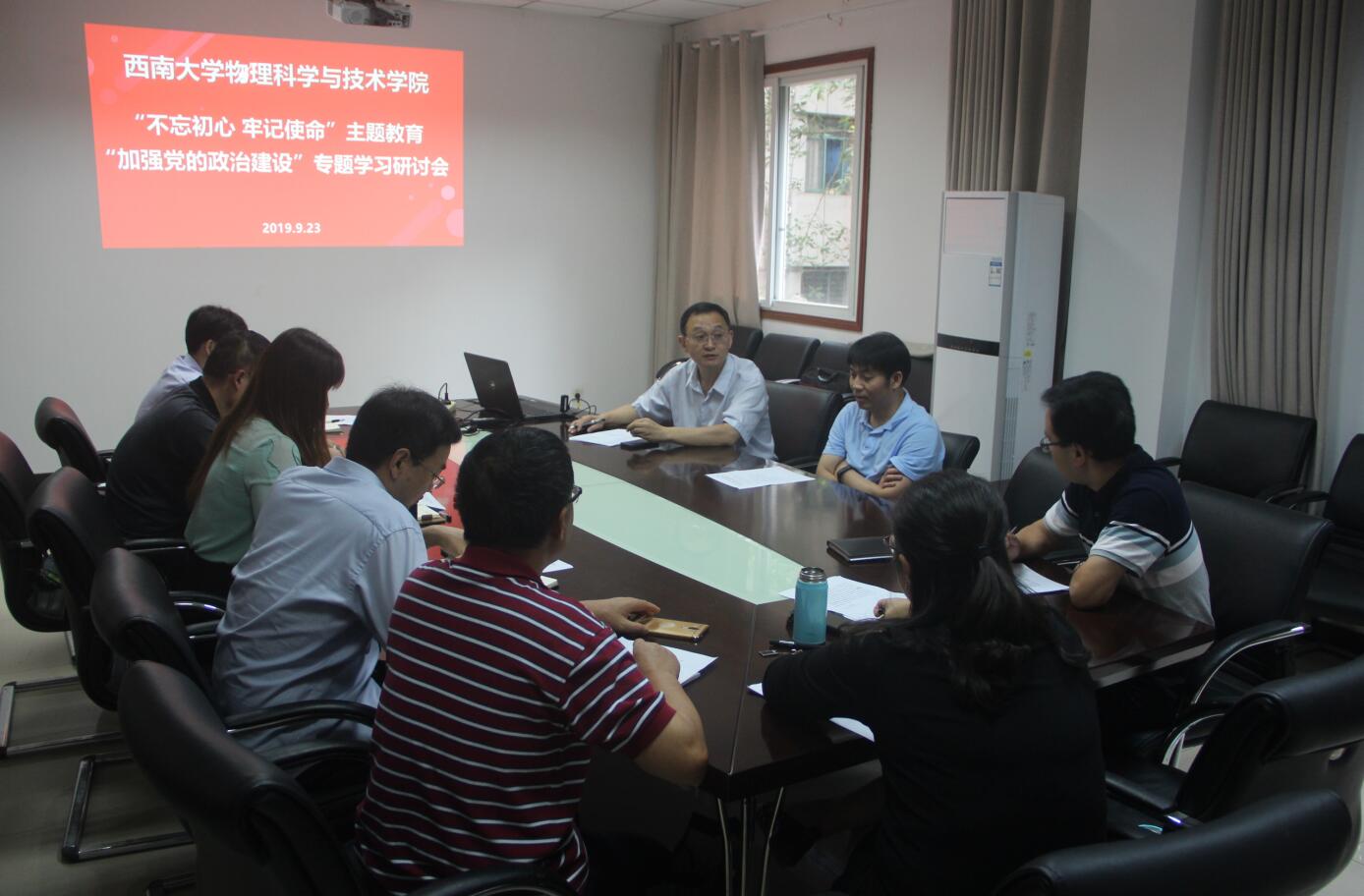 为深入学习贯彻习近平新时代中国特色社会主义思想,扎实推进开展“不忘初心、牢记使命”主题教育, 9月23日下午,胜游体育(中国)官方在线领导班子在二楼会议室开展“不忘初心、牢记使命”主题教育之“加强党的政治建设”专题学习研讨。党委书记李建光主持学习。
