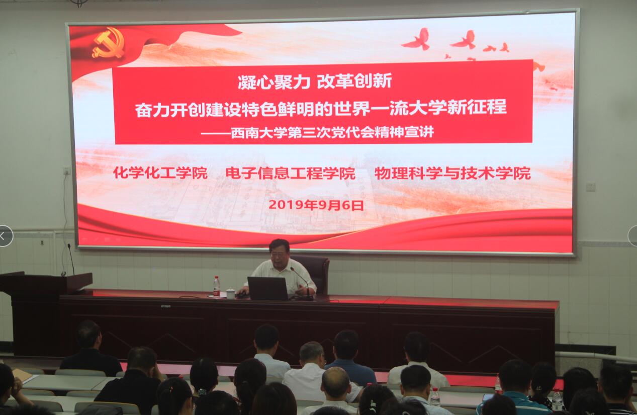 今年7月10-12日,西南大学第三次党代会胜利召开。9月6日下午,根据学校党委胜游体育学习宣传贯彻第三次党代会精神的统一部署,学校宣讲团成员、党委常委、副校长崔延强教授来到我院,就全面学习宣传贯彻学校第三次党代会精神作专题宣讲。来自化学化工胜游体育(中国)官方在线、电子信息工程胜游体育(中国)官方在线和物理科学与技术胜游体育(中国)官方在线200余名教职工参加了宣讲报告会。报告会由胜游体育(中国)官方在线党委书记李建光主持。