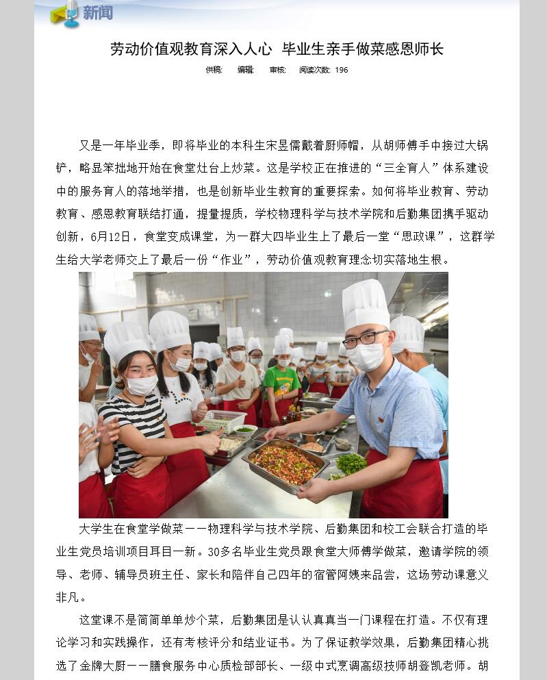 活动策划人之一、校工会副主席郑劲松则认为,大学生毕业前的最后一课“学做菜”,把感恩教育、劳动教育、毕业离校教育等融为一体,其实是全国教育大会所强调的“加强大学生劳动教育”的一次生动实践,是当年陶行知先生所主张的“生活即教育”理念的当代实践。