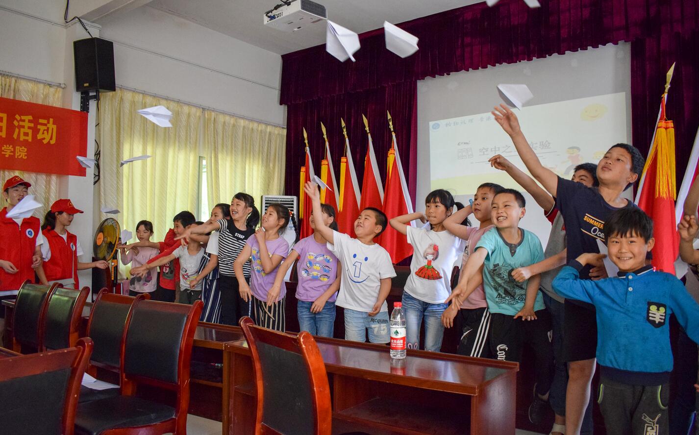 如何利用水的张力让摆好的火柴棍变成五角星?怎样运用物理知识让纸飞机飞得更远?如何利用受力平衡让乒乓球悬浮在空中? “红帽子”大哥哥、大姐姐们为小朋友们分发了实验器材,耐心指导各项演示实验,还带来了学习用品赠送给小朋友们。小朋友们兴致勃勃、踊跃参与,在游戏中学习科学知识,别开生面的课程让村里的孩子们乐开了花。