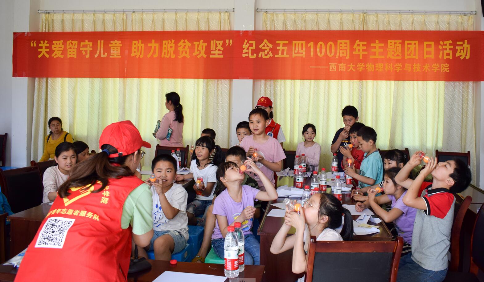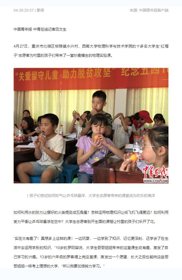 4月27日,胜游体育(中国)官方在线团委学生会牵头,集合本科生党员先锋队和科普空间站学生骨干组成一支十二人的“红帽子”青年志愿者服务队走进市级贫困村北碚区柳荫镇永兴村,开展“关爱留守儿童 助力脱贫攻坚”纪念五四一百周年主题团日活动,为村里的孩子们带去妙趣横生的物理实验课,以青春力量参与地方扶贫工作,得到《中国青年报》关注报道。