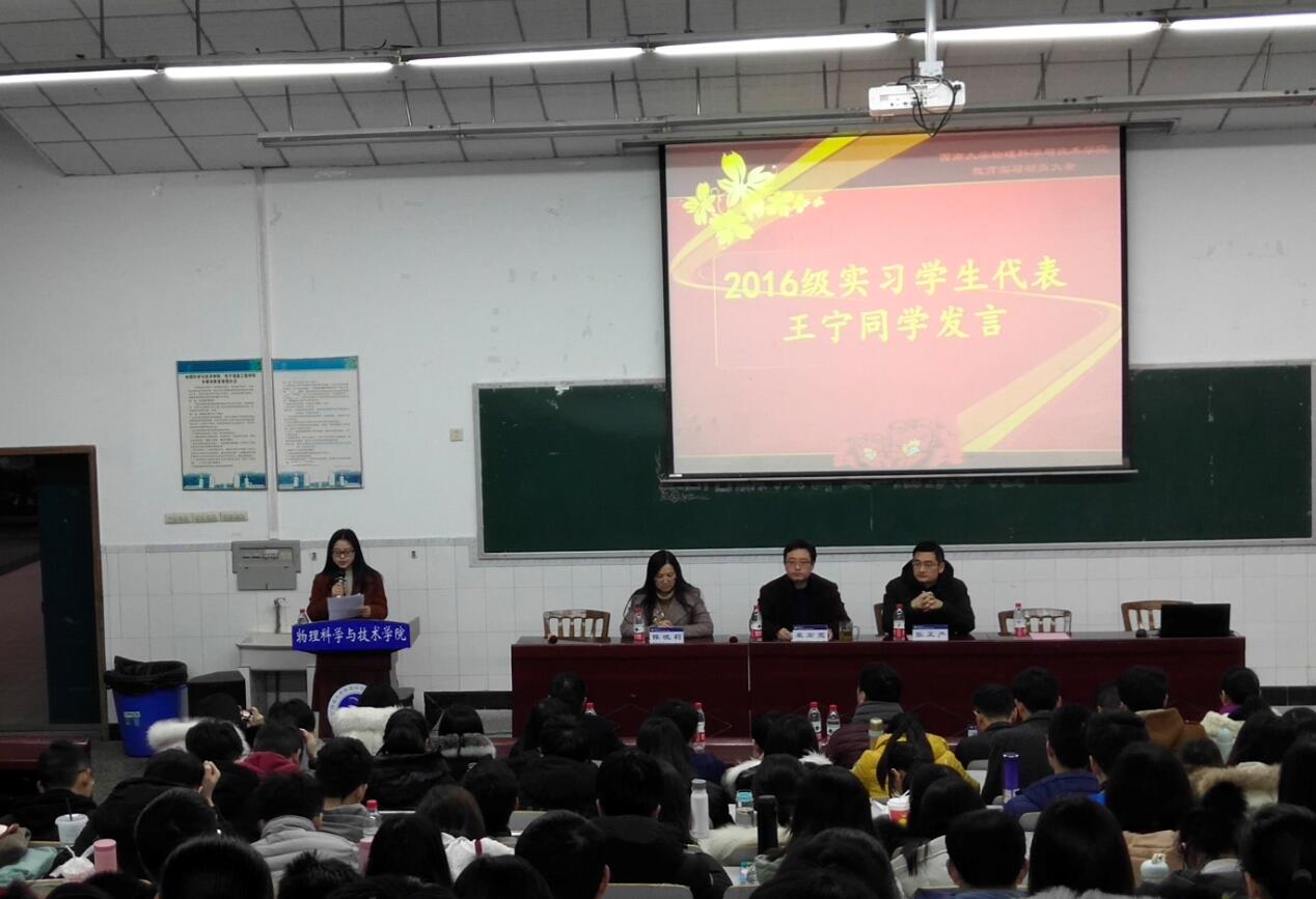 1月15日上午,2019年本科生实习动员大会在胜游体育(中国)官方在线大阶梯教室举行。副院长袁宏宽教授、院长助理张正严副教授、物理教育教研室副主任陈晓莉副教授,实习指导教师马忠平、李太华、蒋小平、邓磊、陈历相、年级辅导员唐昊坤出席动员会,2016级全体公费师范生参会。