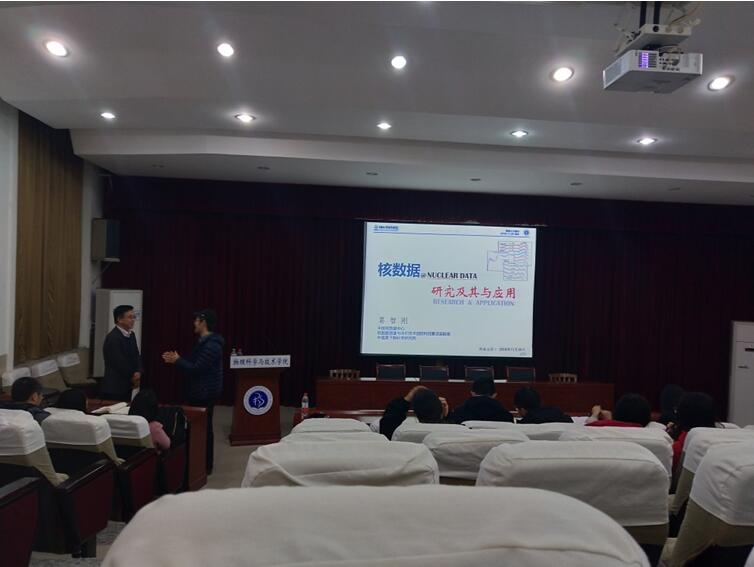 11月30上午9:30,报告准时开始,报告会由李志攀教授主持,来自全校近百名师生参加了报告会。在报告中,葛智刚研究员从核数据的基础研究入手,依次介绍了原子核的基本特性、元素周期表与核素图、核的放射性、核衰变、核的稳定性以及核反应的基本原理等,使同学们对核有了正确的认识。接着列举了大量的生活实例引出了核的特性应用,包括国家安全、能源、核基础研究、核技术应用的介绍,突出了核数据研究的重要性,让同学们体会到核就在我们身边,葛智刚研究员提醒同学们,不要害怕核,但也不能轻视。