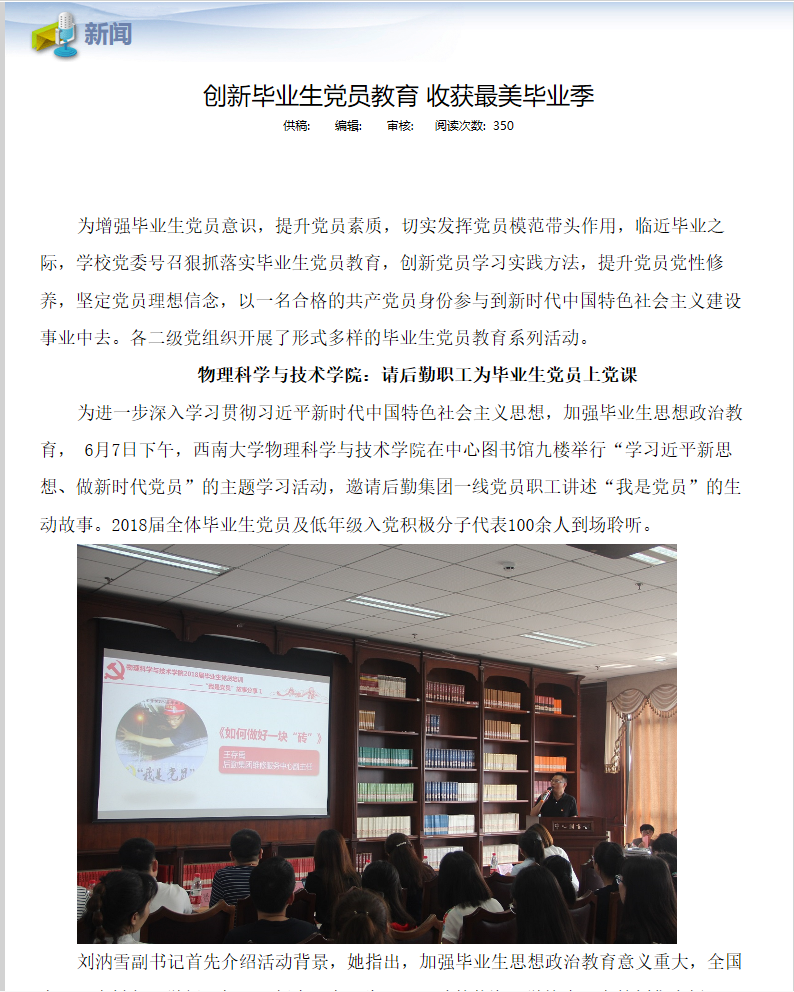 为增强毕业生党员意识,创新党员学习实践方法,6月7日下午,胜游体育(中国)官方在线党委专门为全体毕业生党员和部分低年级党支部代表举行题为“学习习近平新思想、做新时代党员”的特殊党课。之所以特殊,是因为——站在讲台上的不是专家教授,也不是书记院长,而是扫过宿舍、倒过垃圾、疏通过下水道的该校后勤集团一线职工,但他们都有共同的一个身份“共产党员”。