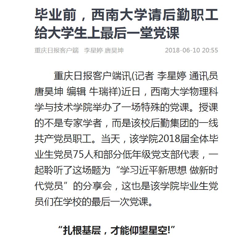 “最基层的体验,也许最真切;最朴实的故事,也许最动人!”曾在后勤集团工作过的学校党委宣传部副部长郑劲松认为,这次党课之所以让学生们“听得进去、听得感动”,从认知心理学角度讲,因为这些职工对大学生来说,熟悉而陌生,看似反差,其实有可能揭示了生活的本质,大学生们毕业后,大多都是从一线做起,这些来自一线但通过奋斗而成长起来的党员,对大学生来说,就是一本最接地气的形象“教科书”。