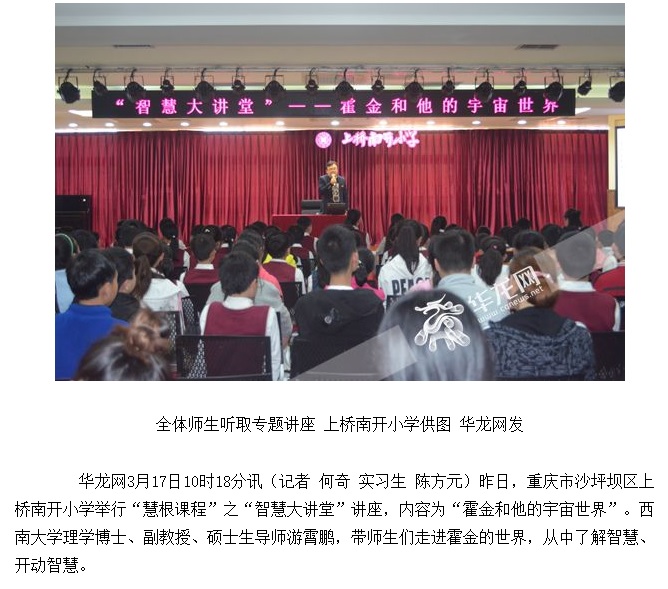 据上桥南开小学的老师介绍, 这是学校的“慧根课程”之“智慧大讲堂”系列讲座之一,游博士的讲解不仅让现场师生们了解到霍金一生重要的事迹、主要的学术成就,更让师生们感受到霍金的智慧和科学的魅力。