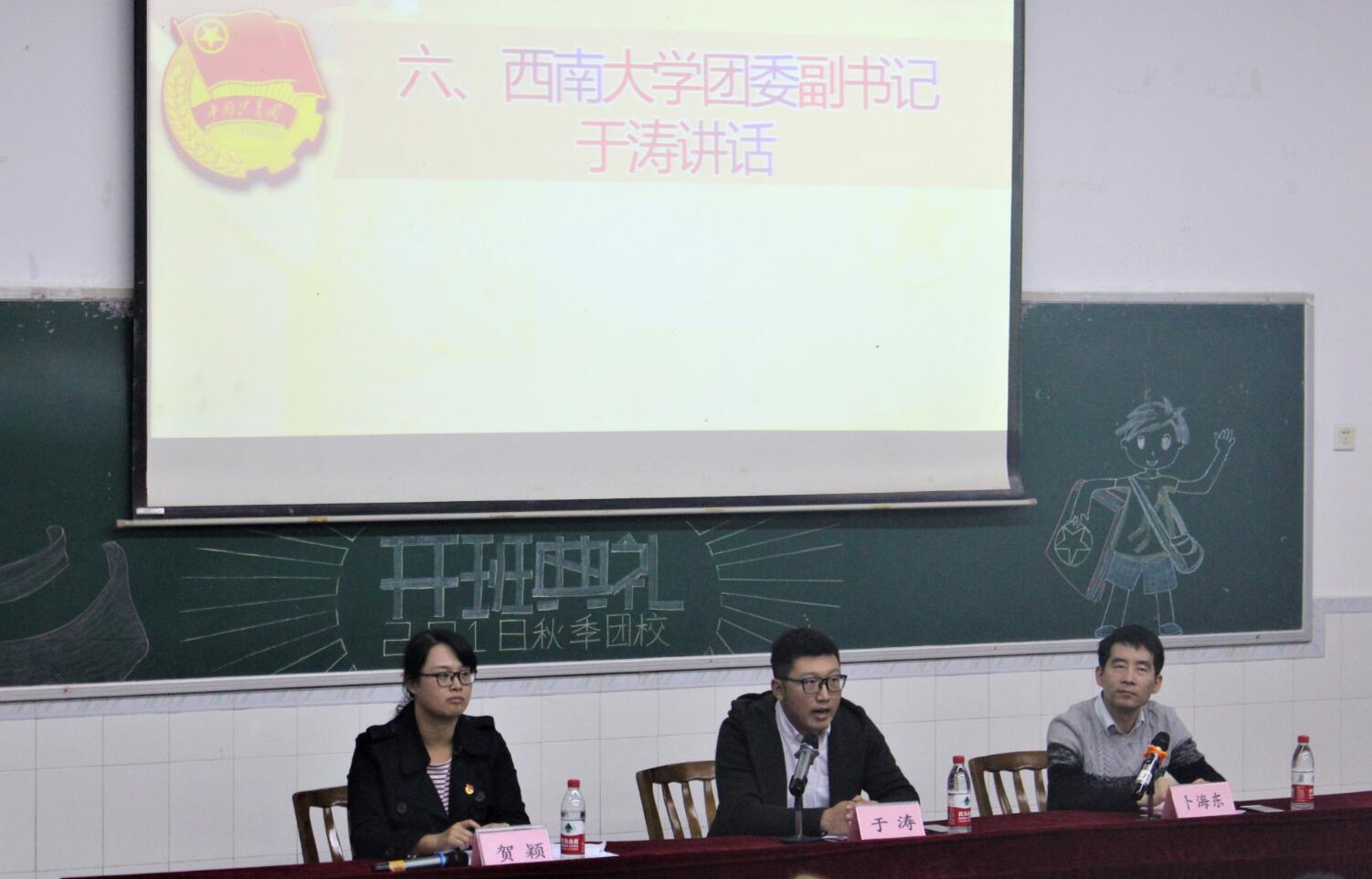 开班仪式结束后,于涛副书记以“团控英雄——漫谈共青团、学生干部和新媒体工作”为题展开了团校第一讲。他结合个人成长经历,分享了大学时间规划经验,并在个人素养提升方面提出了建议;对西南大学团学组织的组织构架、运行机制、工作主线、重点工作等进行了介绍,从责任与义务、内容与形式、方法与技巧三个方面具体讲解了新时代的青年应如何应用新媒体技术开展学生工作。