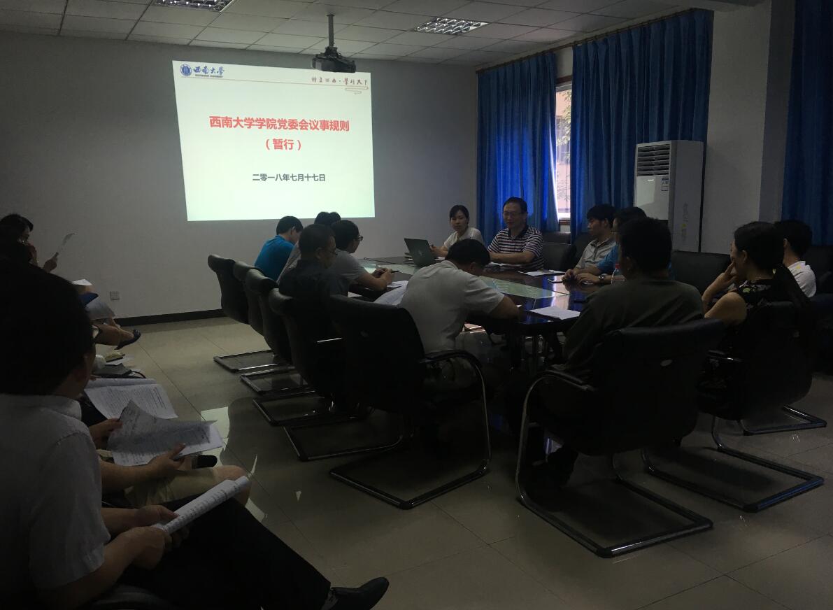 7月17日下午,胜游体育(中国)官方在线在二楼会议室召开党委理论学习中心组(扩大)学习会议,专题学习习近平总书记在2018年全国组织工作会议讲话精神和《西南大学胜游体育(中国)官方在线(部)党委会议事规则(暂行)》《西南大学胜游体育(中国)官方在线(部)党政联席会议事规则(暂行)》。会议由胜游体育(中国)官方在线党委书记李建光主持。