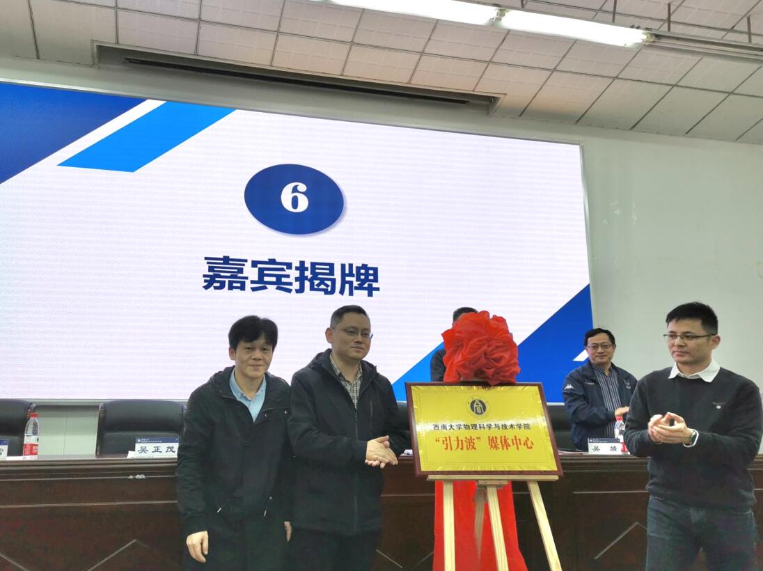 李文富处长、吴靖副部长与吴正茂院长一同为“引力波”媒体中心揭牌。