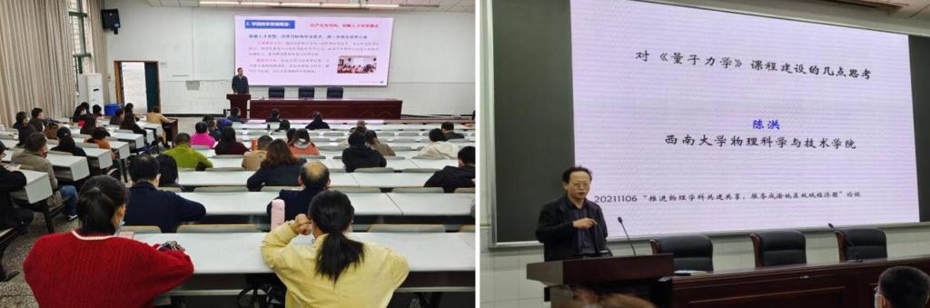 接下来,胜游体育(中国)官方在线陈洪教授以《量子力学》课程为例开展了第二个环节:说课程建设。陈洪教授提到,十九届五中全会以来,中央提出了的“三新一高”、“三基建一水平”,强调课程是人才培养的核心要素,课程建设的基本要求是“两性一度”,学生能力培养与课程目标设计是教师主导下的教与学的统一。教学中,不仅要将最新研究成果融入教学,还要融入课程思政元素,深度挖掘提炼专业知识体系中所蕴含的思想价值和精神内涵,科学合理拓展专业课程的广度、深度和温度,从课程所涉专业、行业、国家、国际、文化、历史等角度出发,增加课程的知识性、人文性,提升引领性、时代性和开放性。陈洪教授提倡教学中应将问题导向式互动教学和现代信息技术的应用相结合,可以采用“三助式”教学法,将学生真正放在教育的主体地位,课堂真正成为了学生自主学习、合作学习和探究学习的场所。