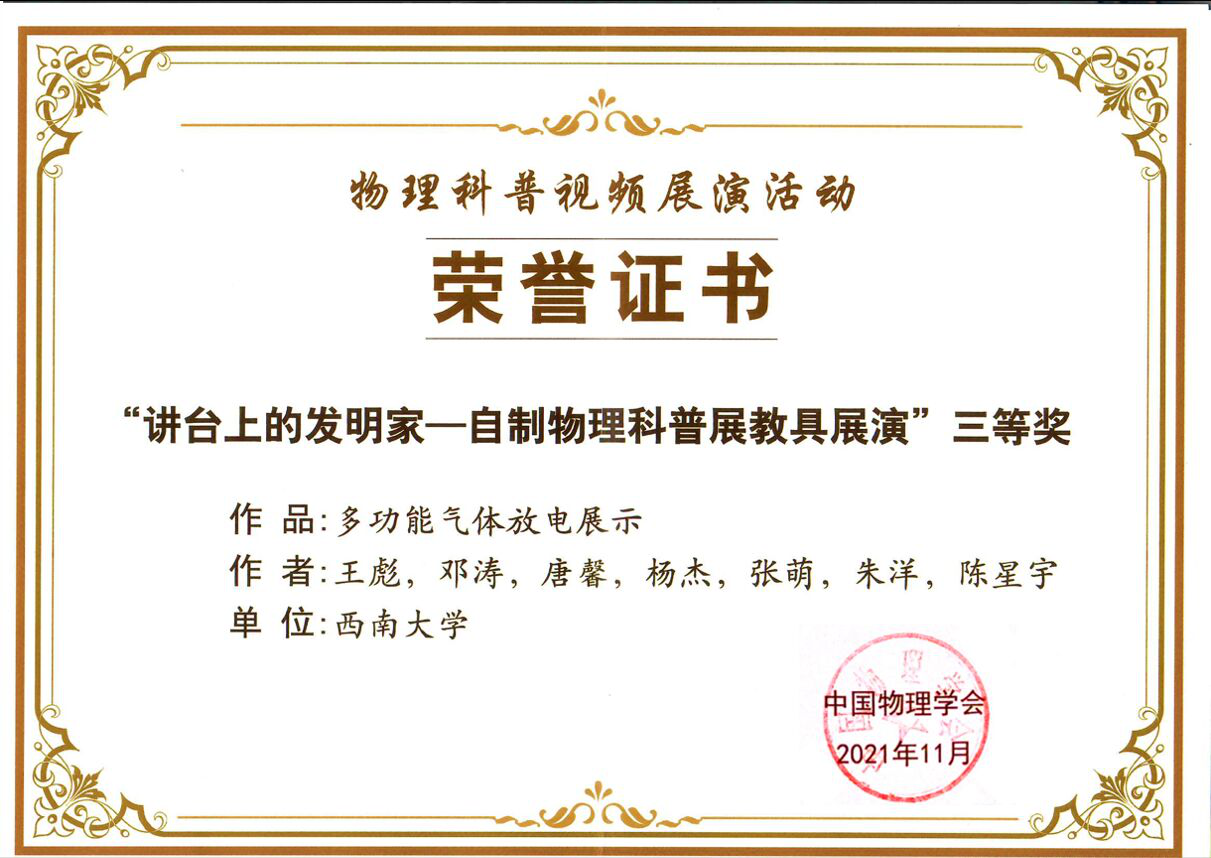 物理科学与技术胜游体育(中国)官方在线三个作品经过各位老师和同学的精雕细琢,反复打磨,在大会中表现优异。由张巧明、杨继勇老师指导的《被中香炉-文物中的物理》获得“科学三分钟——物理科普讲解视频展演活动”二等奖,《天空为什么是蓝的》获得“科学三分钟——物理科普讲解视频展演活动”优秀奖,由王彪、邓涛老师指导的《多功能气体放电演示》获得“讲台上的发明家——自制物理科普展教具展演活动”三等奖。