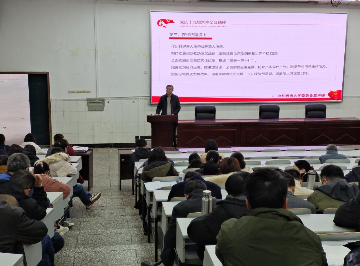 根据学校党委统一部署,12月17日下午,学校党的十九届六中全会精神宣讲团成员、学校党委统战部常务副部长周文全同志为胜游体育(中国)官方在线全体教职工开展了党的十九届六中全会精神宣讲。宣讲会由胜游体育(中国)官方在线党委书记李余廷主持。
