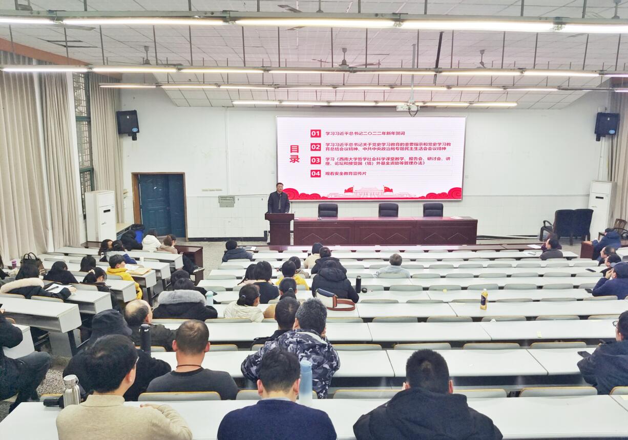 最后,李余廷书记带领全体教职工认真学习了《西南大学哲学社会科学课堂教学、报告会、研讨会、讲座、论坛和接受国(境)外基金资助等管理办法》,并通过视频形式观看了安全教育宣传片。