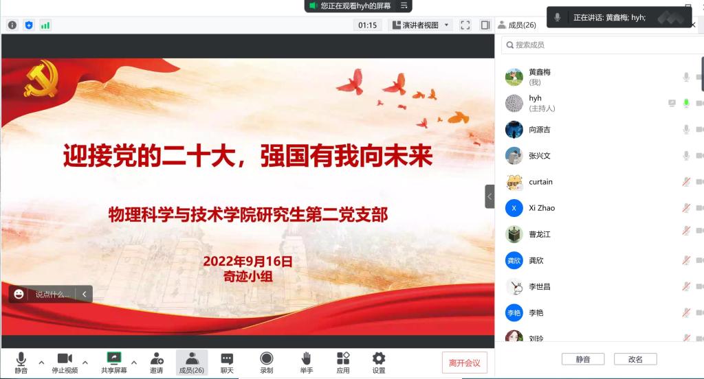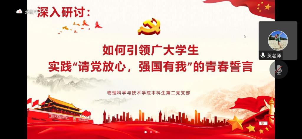学生各支部组织全体学生党员认真观看了《国家记忆》纪录片《不负韶华强国有我》视频,组织党员专题领学习近平总书记在省部级主要领导干部“学习习近平总书记重要讲话精神,迎接党的二十大”专题研讨班上的重要讲话精神和习近平总书记给北京师范大学“优师计划”师范生的回信精神。交流研讨环节,各支部积极组织党员同志紧密结合自身学习生活实际,就党支部和党员“如何引领广大学生践行‘请党放心,强国有我’的青春誓言”进行了深入讨论。本科生第三党支部张思沂同志谈到,再次看到黄文秀同志还是会被她将小我融入进大我,全心全意为脱贫事业而奋斗的事迹所深深触动。在接下来的学习生活中,要进一步夯实专业功底,提升教书育人本领,以实际行动践行好“请党放心,强国有我”。参与今年九月北碚缙云山山火扑灭的志愿活动的研究生第二党支部胡远鸿同志在研讨发言时说,森林消防官兵和武警战士在危难时刻不怕牺牲往前冲、不扑灭不下火线的精神品质就值得自己在未来科研路上应该学习和继承,努力在科研报国实践中发挥青年力量。