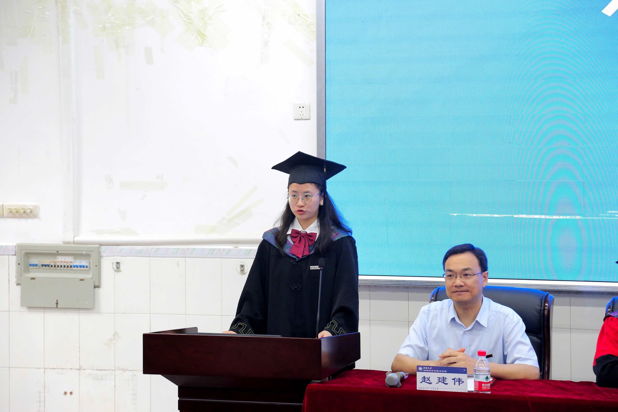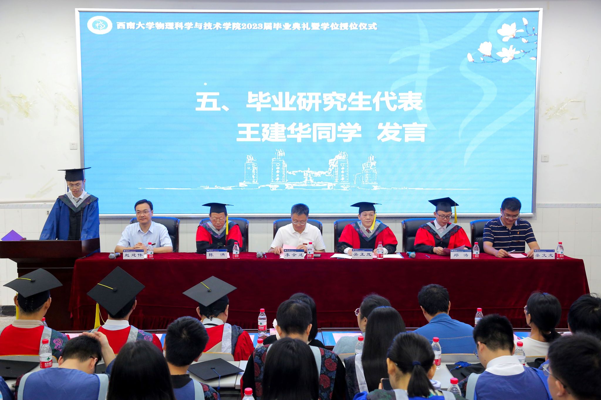 理论物理专业王建华、物理学专业蒋若冰同学分别作为毕业研究生、本科生代表发言。王建华同学回忆了自己充满挑战和欢喜的研究生生活,分享了“学会分析与思考,学会忍耐和锻炼,学会合作与竞争”三点成长收获。他诚挚地向导师同窗致谢,祝福胜游体育(中国)官方在线各项事业再创辉煌。蒋若冰同学分享了自己感受物理之美、享受科研乐趣的故事,她感恩西大提供的优越的学习成长环境,号召同学们贡献青春力量,共续母校荣光。