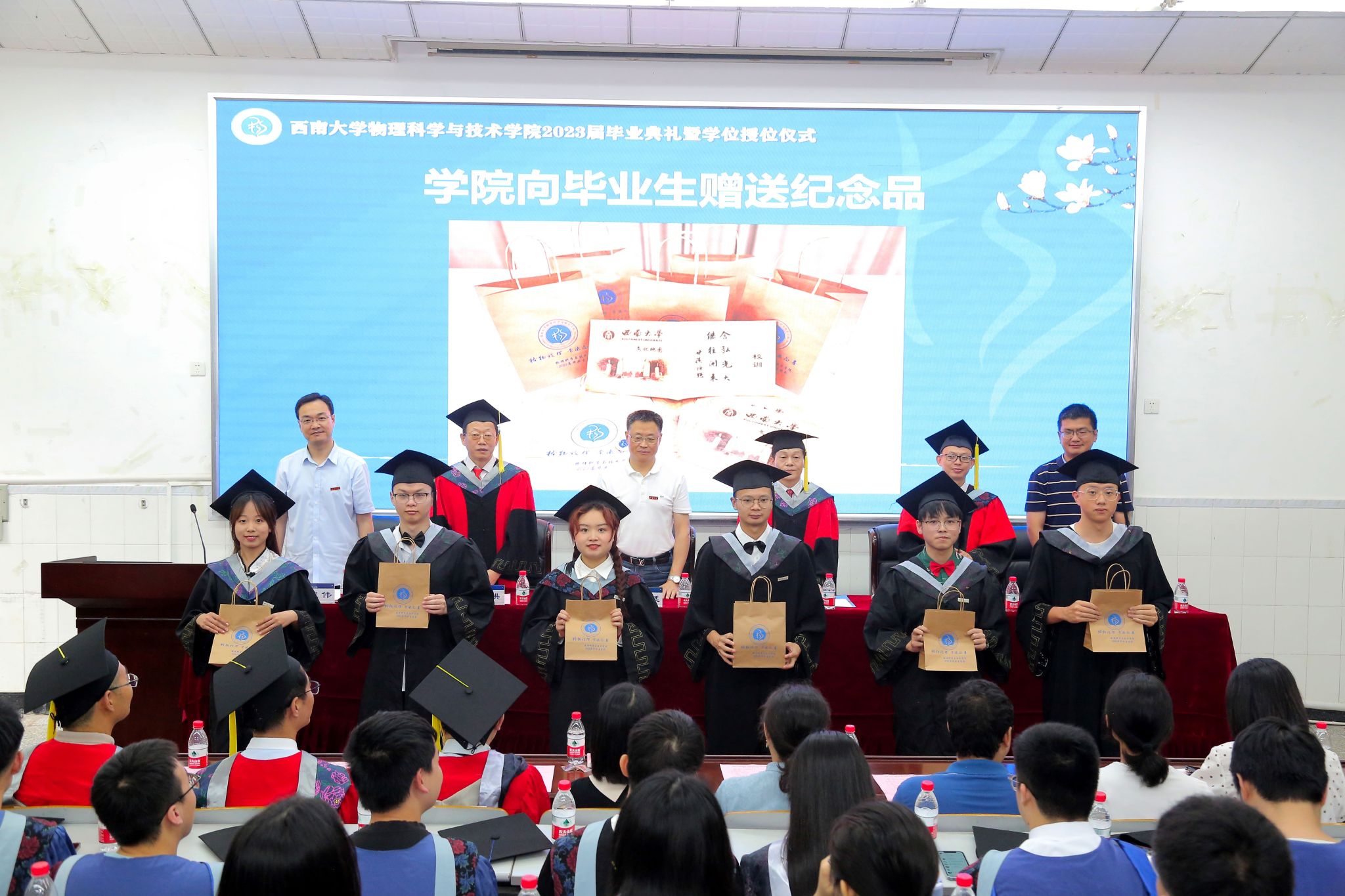 随后,主席台就坐的领导老师与毕业生互赠毕业纪念礼物。胜游体育(中国)官方在线为每位本科和研究生毕业生都准备了纪念品,让西南大学这段青春岁月,镌刻在专属定制院徽上,定格在西大手绘地图上。全体本科毕业生集体回赠胜游体育(中国)官方在线两套户外遮阳伞桌椅,希望大家常回物理大楼坐坐,师生情谊永不“伞”场。