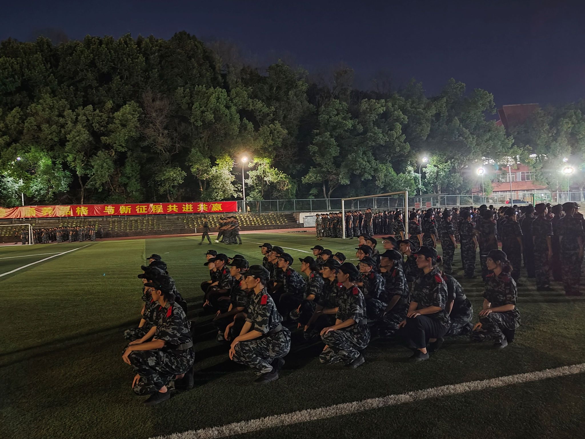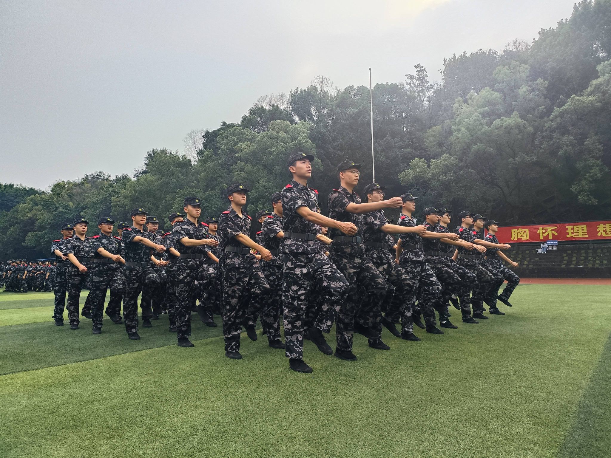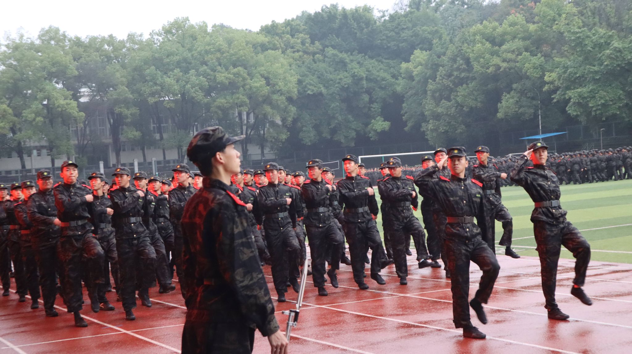 9月13日在学校第一运动场举行的军训动员大会拉开了集中军训的帷幕。“稍息!”“立正!”“向右看齐!”从清晨到夜幕,在教官嘹亮的口令声中,同学们集结在八连飘扬的旗帜下,刻苦练习着转体、齐步、正步、跑步等各项基本动作。烈日炎炎下,汗水浸透后背;绵绵细雨中,雨滴润湿衣衫。承训教官在严格要求出操纪律的同时,认真示范每一个动作,力争让每一位同学都掌握基本的军事技能。训练后期,同学们参加分列式方队、心理健康操方队、应急棍方队和匕首操方队等特色科目的学习,培养了团队意识,增强了身体素质。在军训空余时间,参训学员学习寝室内务整理,开展国防安全教育。在教官组织休息时,在点点星空下物院新生以训练场为舞台,展示才艺、齐唱军歌。