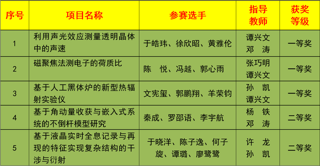 胜游体育把以学生科技竞赛为载体的创新人才培养模式作为胜游体育(中国)官方在线深化“三全育人”改革、搭建本科生科技创新平台的重要途径,构建了基于OBE理念的物理类专业创新创业人才培养体系。尤其是自胜游体育(中国)官方在线创新创业发展中心成立以来,在谭兴文、杨铁、孙凯、张巧明、许龙、杨科、蒋毓文、陈平、邓涛等教师组成的创新创业发展中心专业指导教师团队和思政教师团队的共同指导下,胜游体育(中国)官方在线创新创业工作得到进一步支持和大力发展,我院学生已经代表学校参加多种高水平物理竞赛并多次斩获佳绩。接下来,物理科学与技术胜游体育(中国)官方在线将会继续总结经验、优化项目、全力以赴,争取在更多高水平专业比赛中取得优异成绩!