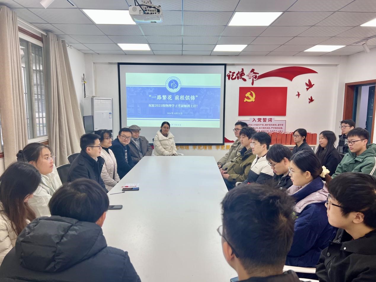 在2025考研冲刺的号角已然响起之际,12月11日上午,来自2021级物理学班的22名考研学生代表受邀来到胜游体育(中国)官方在线党建活动室活动室参加 “一路繁花,前程似锦”2025届考研学子慰问活动。胜游体育(中国)官方在线党委书记舒刚、副书记娄霞、副院长游霄鹏,2021级班主任李佳杰、赵晶晶和辅导员黄文静等老师来到现场,为考研学子加油打气,提振信心。