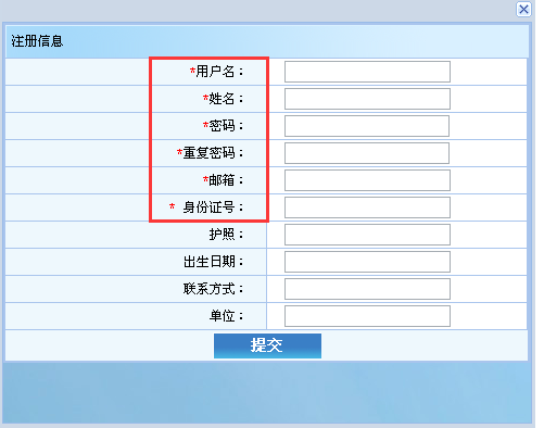 第2步:对于新用户,必须点击 “注册” 按钮,进入注册界面如下图所示.在注册界面中,输入注册信息点击 “提交” 按钮,完成注册。(注:红色 星号所标注的输入项为必填项)。