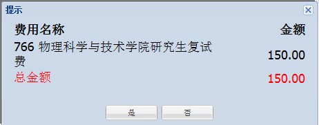 第3步:在跳出费用信息确认窗口(如下图),请确认上面信息准确无误后,点击左下方“是”按钮