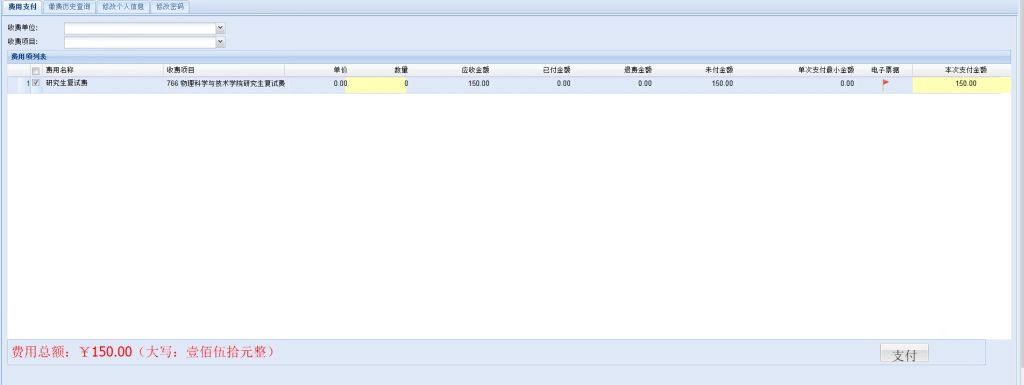 第2步:点击左上方“费用支付”界面,在费用项列表内选中(打勾)“研究生复试费”,点击右下方“支付按钮”。