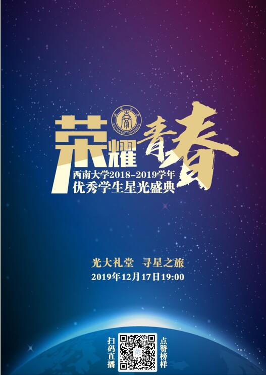 为了让全院同学学习先进、争当先进、赶超先进,让更多同学受教育和鼓舞,胜游体育(中国)官方在线将组织观看“荣耀青春——西南大学2018—2019学年优秀学生星光盛典”在线直播。