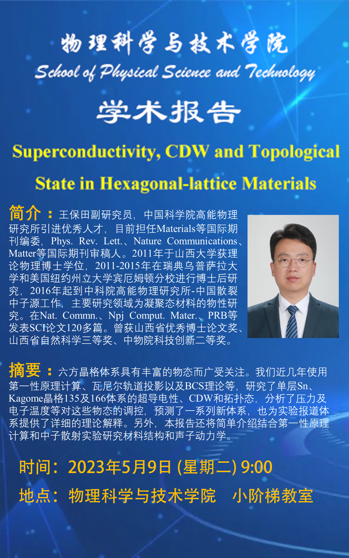【学术报告】Superconductivity, CDW and Topological State in Hexagonal-lattice Materials