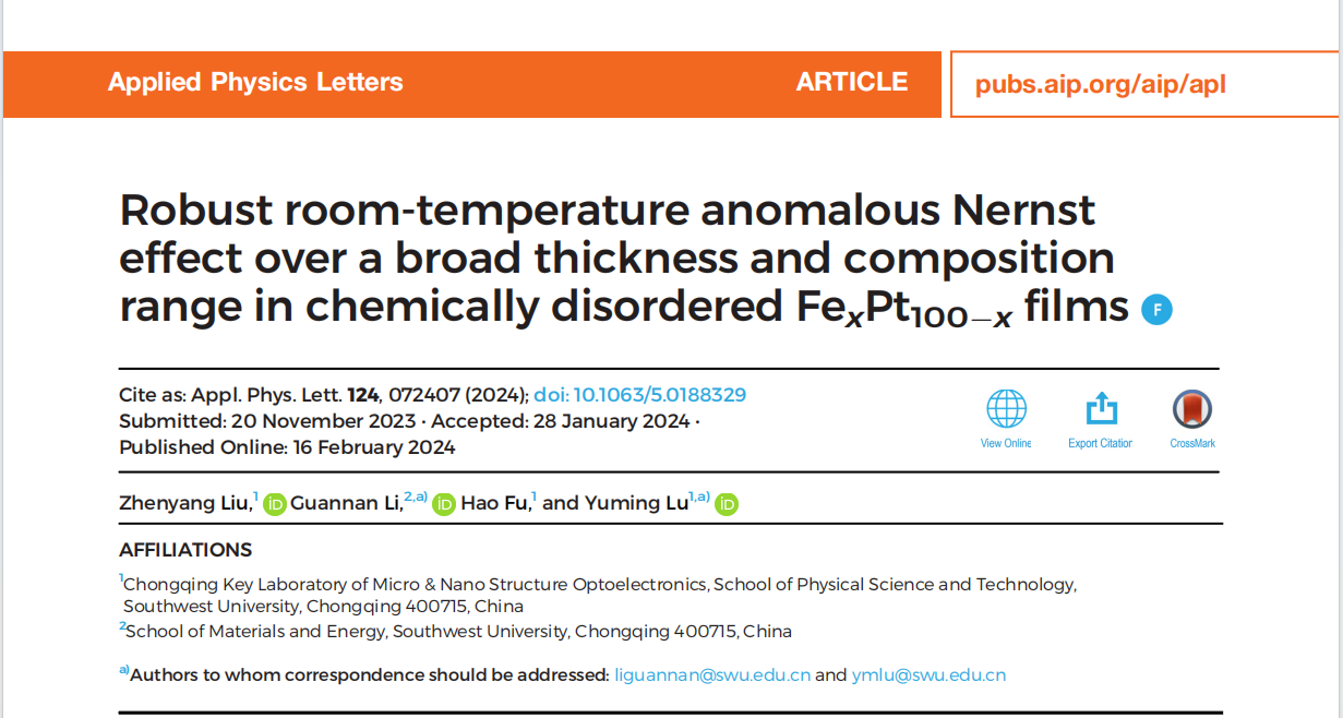 磁学与磁性材料是我院较早布局的研究方向之一。近日,我院新型磁性功能材料及器件团队卢玉明课题组在无序合金磁性薄膜反常能斯特效应领域取得新进展,相关成果以题为“Robust room-temperature anomalous Nernst effect over a broad thickness and composition range in chemically disordered FexPt100-x films” 发表在自然指数期刊《Applied Physics Letters》上,并被编辑部遴选为亮点论文“Featured article”(入选率约为10 %)。我院硕士研究生柳桢杨为论文的第一作者,卢玉明副教授为最后通讯作者,西南大学为唯一完成单位。