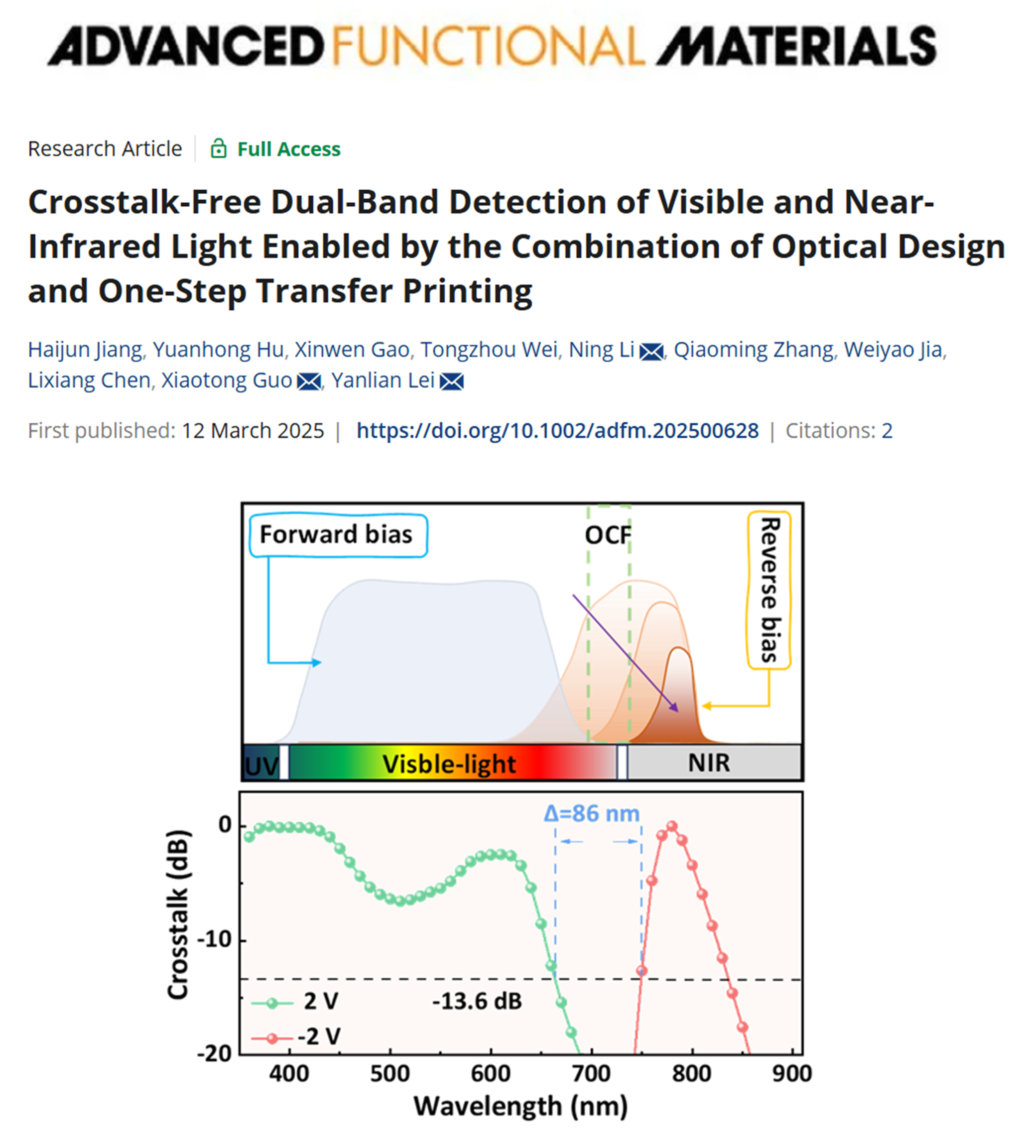 光学串扰会对图像识别和光通信等应用中的检测精度产生不利影响,是传统双波段光电探测器面临的一个关键挑战。针对这一问题,团队提出了一种通过垂直背靠背堆叠结构来消除双波段有机光电探测器中光学串扰的有效策略。该策略将用于短波长(可见光)吸收的异质结置于前侧,而用于长波长(NIR)吸收的异质结置于后侧。与以往通过增加前端单位厚度或增加光学间隔层的方法不同,团队利用一步转印方法增加后侧NIR吸收层的厚度。该技术不仅克服了溶液法制备有机厚膜的技术难题,还实现了双波段探测器中无串扰的光响应。基于器件内光场分布优化和电荷收集窄化机制,有效滤除了的短波长光的信号干扰,从而实现了在正向偏压下可见光和在反向偏压下窄带NIR光的独立检测。更重要的是,该方法适用范围广,不需要对吸收层进行特殊选择或设计,并成功验证了其在抗干扰信号检测和光通信中的应用,为未来开发无光学串扰多模光电器件提供了新思路。以上结果以“Crosstalk-Free Dual-Band Detection of Visible and Near-Infrared Light Enabled by the Combination of Optical Design and One-Step Transfer Printing”为题发表在《Advanced Function Materials》(2500628, 2025)上,我院2022级硕士研究生蒋海军为该论文的第一作者,雷衍连副教授、南京理工大学李宁教授、重庆赛宝工业研究院郭小童博士为论文通讯作者,胜游体育(微纳结构光电子学重庆市重点实验室)为第一完成单位。
