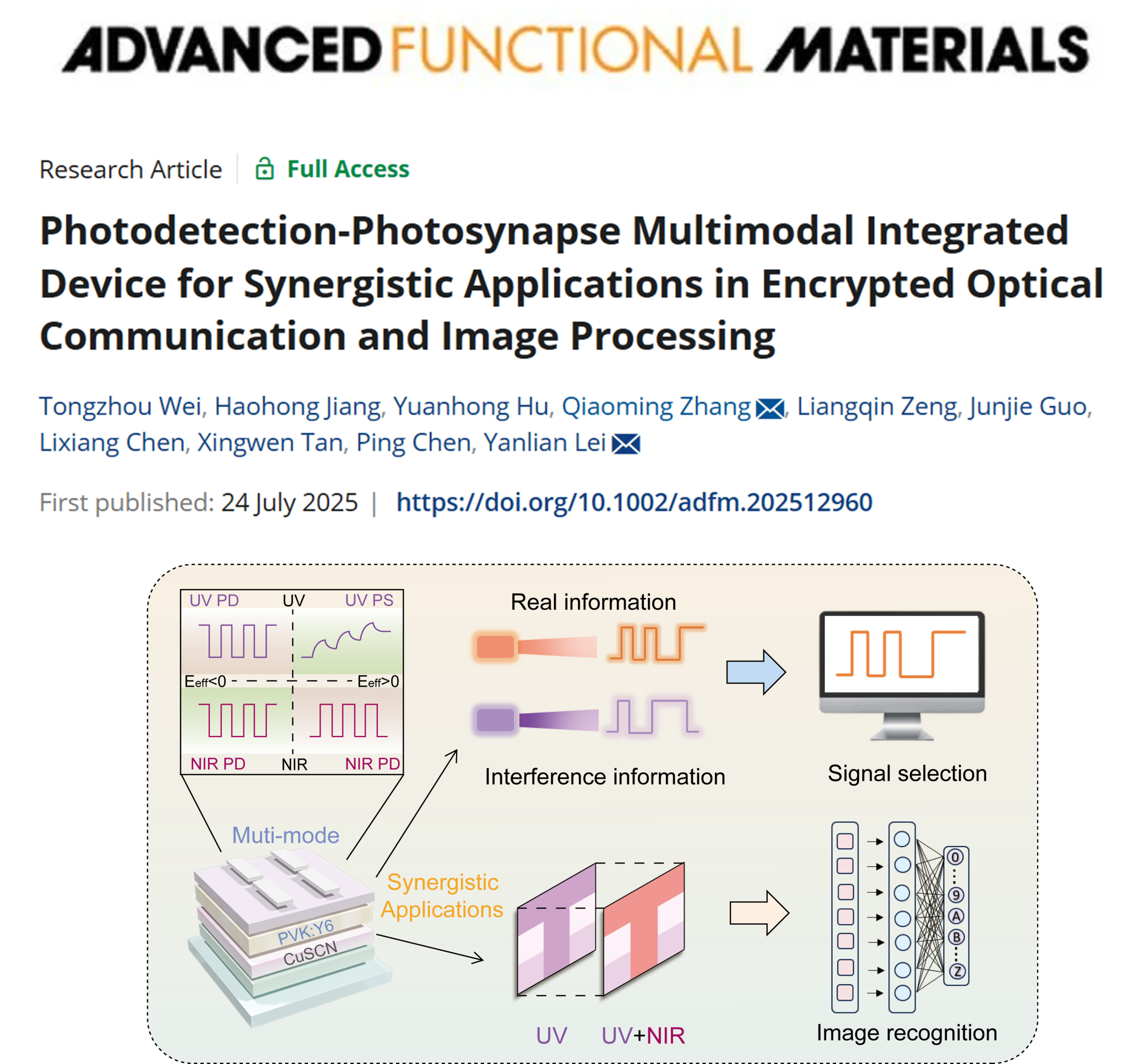 团队基于界面电荷俘获与光生载流子的可控迁移,构建了一种基于复合异质结结构(CuSCN/PVK:Y6)的多模态光电器件,在单一器件内实现了紫外探测、紫外光突触、近红外探测三种功能的无缝切换(仅需调节工作电压或激发波长即可)。该器件巧妙地将光探测和光突触间巨大响应速度差异这一功能集成瓶颈转换成二者协同应用的新范式。在光电探测中,通过频率选择光响应实现信号了加密与解密;在图像识别中,通过近红外探测模式辅助增强紫外成像,显著提升低照度目标识别精度。该成果可为多模态光电器件的集成设计以及神经形态视觉系统提供了一种紧凑、低功耗、功能可重构的硬件雏形。相关结果以“Photodetection-Photosynapse Multimodal Integrated Device for Synergistic Applications in Encrypted Optical Communication and Image Processing”为题发表在《Advanced Function Materials》(e12960, 2025)上,我院2023级硕士研究生魏同舟为该论文的第一作者,雷衍连和张巧明副教授为通讯作者,胜游体育(微纳结构光电子学重庆市重点实验室)为唯一完成单位。