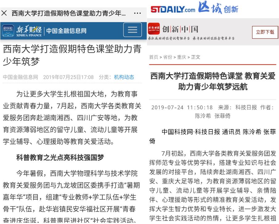 2019年7月初暑假期间,物理科学与技术胜游体育(中国)官方在线教育关爱服务团与重庆九龙坡团区委携手推进“暑期嘉年华”项目,组建“专业教师+学工队伍+学生骨干”的人员队伍,赴华岩镇民安华福公租房社区开展了“青春奋进庆华诞,科普惠民进社区”师生主题社会实践活动。本次科普体验营结合教学与实践,创新“市民学校+高校资源+暑期教育+志愿服务”的实施模式,由实践团的同学根据有趣的实验进行知识讲解,由现象到本质,用简单易懂的方式向孩子们开展科普体验营,为孩子们带来沉浸式的科普体验。除此之外,实践团成员还带来了“小小书法家”毛笔书法课、“小巧手、大智慧”手工制作、“少儿启蒙礼”礼仪课等九节内容丰富的七彩课堂,获得社区居民一致好评。中国金融信息网、中国科技网·科技日报等媒体纷纷予以报道。