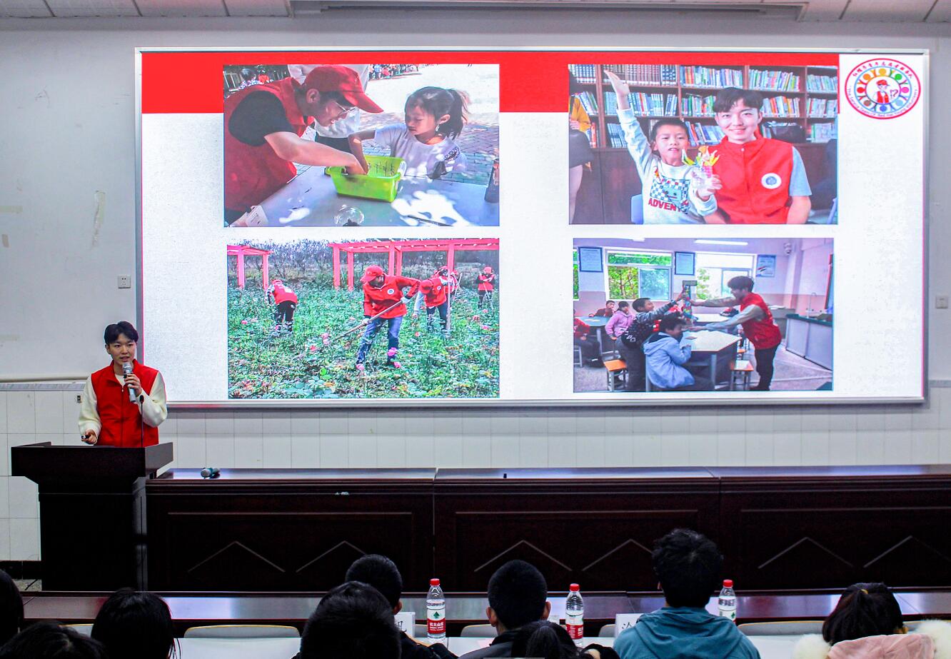 开幕式后,“弘扬伟大抗疫精神,青春助力全面小康”志愿服务故事分享会活动在大阶梯教室随即展开。秦白、吴云龙、王超、苏日古嘎、周建成五位志愿者先进典型作为主讲人,分享了自己的志愿故事。其中,2017级师范3班秦白同学在校期间曾多次参与家电维修、寒假送温暖活动等志愿服务活动,获评校级“志愿服务先进个人”称号。疫情期间主动报名参加社区疫情防控工作组,在零下十几度的天气下测量体温、配送物资、宣传防疫知识;2019级师范1班苏日古嘎同学作为科普创作社的一员,暑假期间带领团队举办“科普惠民,与我同行”科技周系列活动,全面展示了科技创新成就和科技战疫成果。故事会上,她分享了同学们在丰都县三建乡“科普扶贫”活动中利用所学知识激发孩子们科研兴趣的经历,呼吁更多同学关注基础教育、弘扬科学精神。