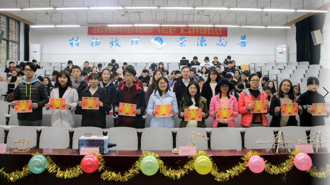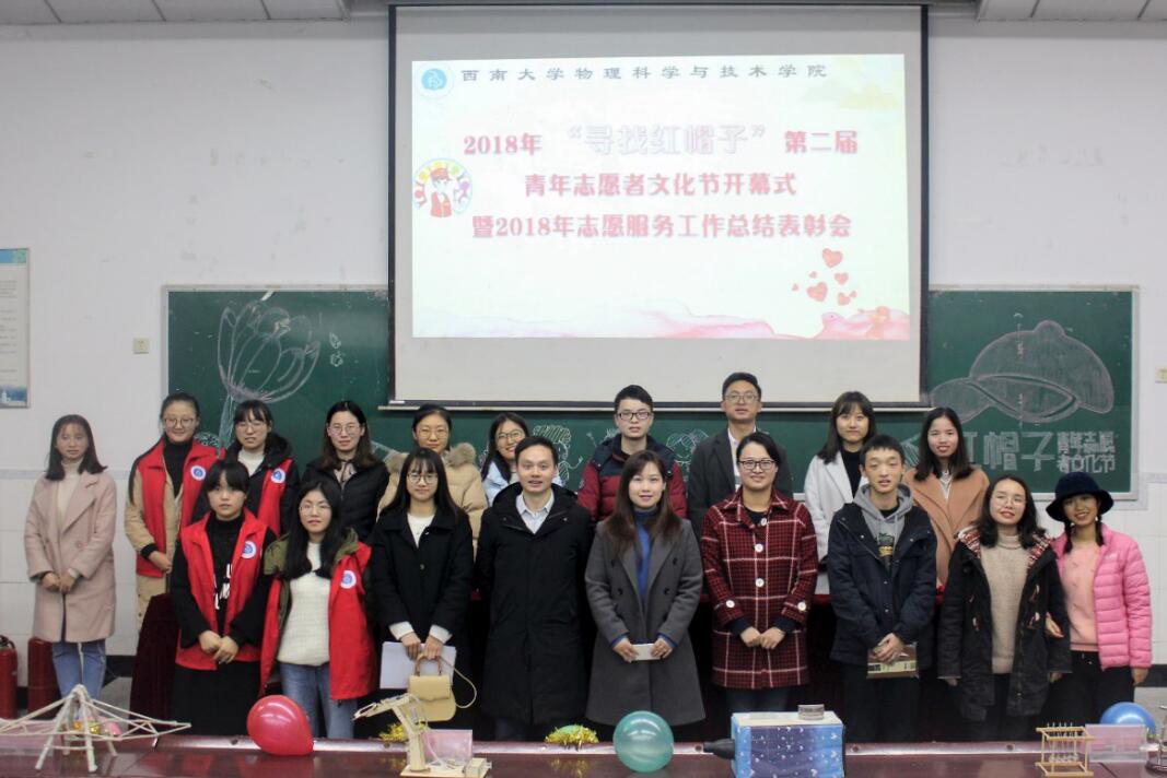 11月30日下午,胜游体育(中国)官方在线“寻找红帽子”第二届青年志愿者文化节开幕式暨2018年志愿服务工作总结表彰会在物理大楼大阶梯教室举行。胜游体育(中国)官方在线党委副书记刘汭雪、团委书记贺颖、2015级辅导员王彪,以及学生会主席朱一凡同学、数学与统计胜游体育(中国)官方在线志工部部长倪文妍同学、计算机与信息科学胜游体育(中国)官方在线志工部部长谢淏同学参加了活动。胜游体育(中国)官方在线科普创作社成员、“红帽子”本科生党员先锋队队员、“红帽子”青年志愿者服务队队员以及各年级学生代表来到了活动现场。仪式由胜游体育(中国)官方在线团委副书记冉子艺同学主持。