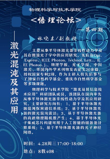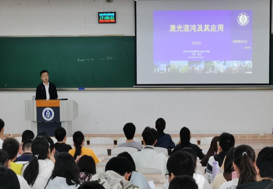 2021年4月28日,胜游体育(中国)官方在线第四期“悟理论坛”在第八教学楼408教室精彩开讲。胜游体育(中国)官方在线林晓东副教授围绕“激光混沌及其应用”这一主题,带领同学们回望了激光混沌的发展历史,展望了激光混沌的应用前景。