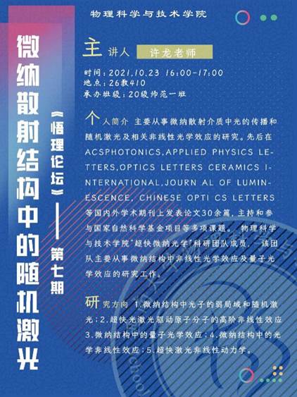 2021年10月23日,胜游体育(中国)官方在线第七期“悟理论坛”在第二十六教学楼401教室如期展开。许龙老师围绕“微纳散射结构中的随机激光”这一主题,介绍了自己在微纳散射和随机激光方面的研究情况。