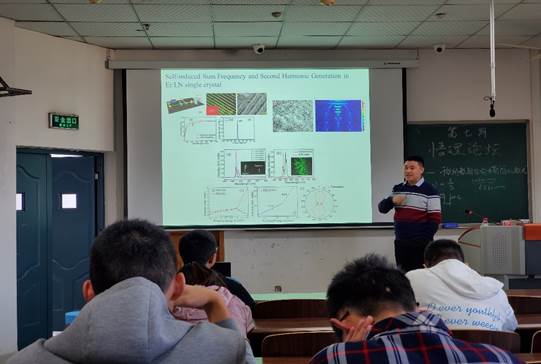 许老师介绍了传统激光的简要机理及主要用途,列举了激光在日常生活中的应用实例,讲述了随机激光产生的原理,以及相较于传统激光的显著特点——其出射方向、频率具有不确定性,也有阈值和光谱窄化现象;光子在随机介质中经多重散射受激放大后射出。随后,许老师介绍了微纳散射结构——以透明掺镧锆钛酸铅陶瓷作为增益分散介质,并展示了随机激光在介质中的现象及相关实验数据。他重点强调了在Er:LN单晶体中的自感和频和二次谐波现象,帮助同学们了解随机激光在不同介质中的特性,最后他分析了β-MgGaO薄膜的电流电压曲线。同学们全程认真聆听,受益匪浅。