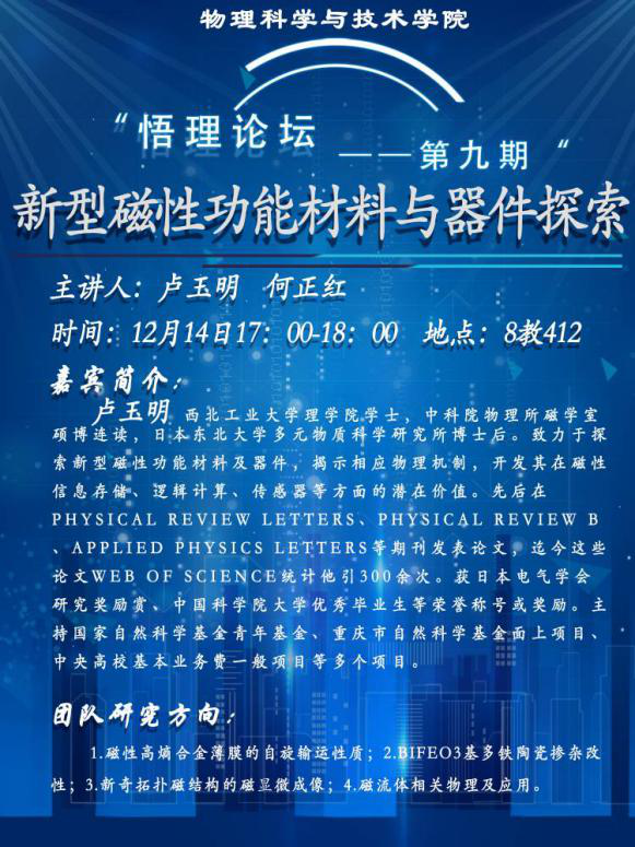 胜游体育(中国)官方在线第九期悟理论坛于2021年12月14日在第8教学楼412教室开展。本次论坛由2021级物理学一班承办,卢玉明副教授和何正红副教授应邀担任主讲嘉宾。