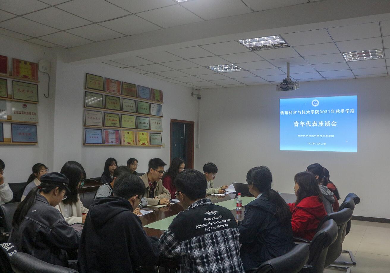 为进一步调研胜游体育(中国)官方在线青年学生的发展需求,有针对性的开展思想政治教育工作, 10月20日下午,胜游体育(中国)官方在线在物理大楼二楼会议室召开2021年秋季学期青年学生代表座谈会。胜游体育(中国)官方在线党委副书记刘汭雪、团委书记贺颖、2020级辅导员晏勇出席,团委学生会、科普社、党员先锋队的学生骨干,校第六次学代会胜游体育(中国)官方在线参会代表以及低年级学生代表共计30人参会。