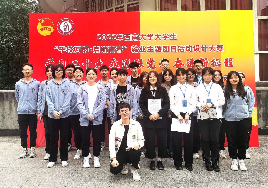 2022年10月23日下午,由共青团西南大学委员会主办,西南大学青年创新创业服务中心承办的西南大学大学生“千校万岗·启航青春”就业主题团日活动设计大赛决赛在圆顶三楼学生活动中心隆重举行。我院2020级物理学(师范)一支部表现出色,最终总得分排名第四,荣获三等奖。