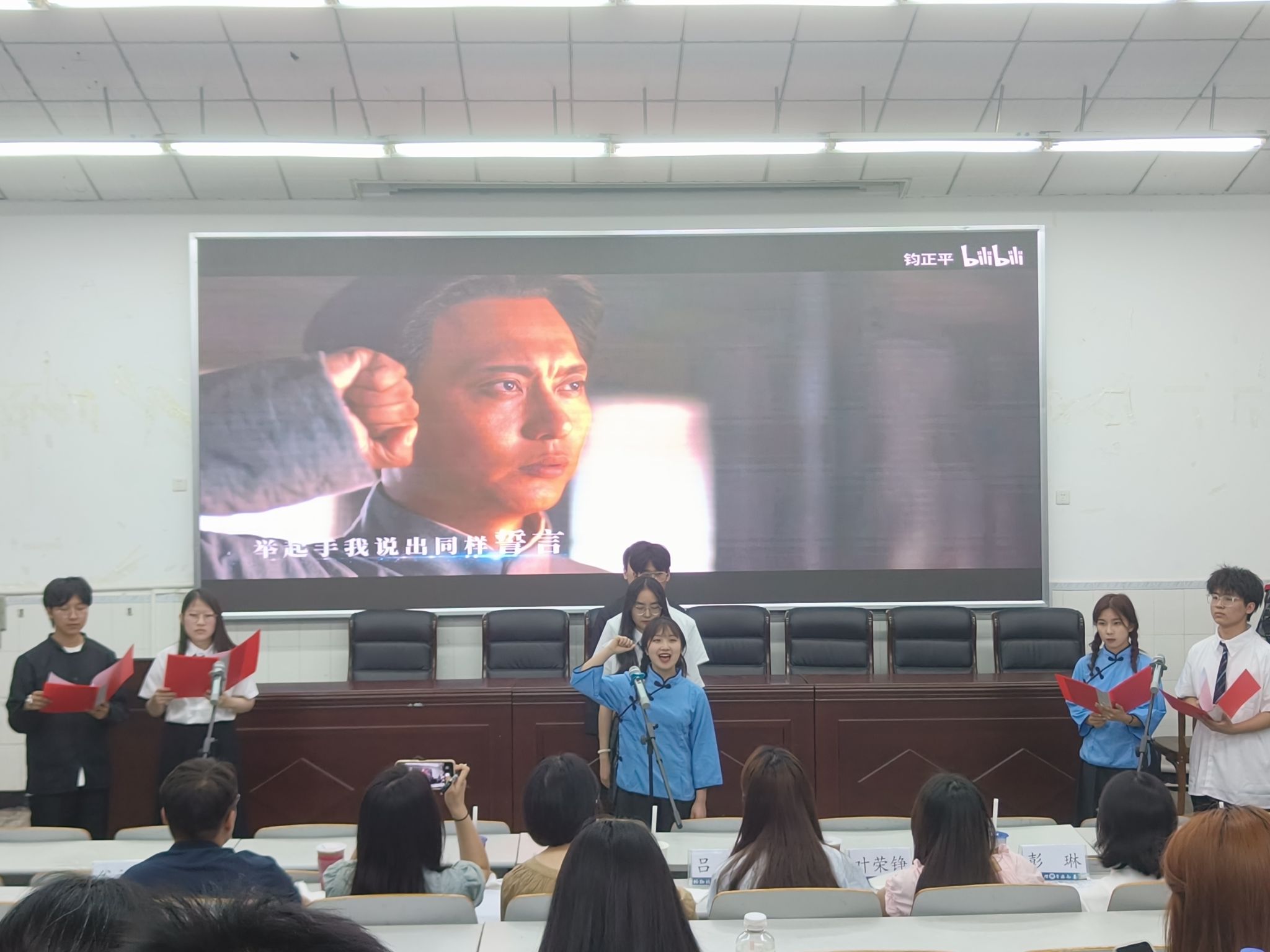 2022级师范5班辅助视频展现国家的发展腾飞以及人民生活的巨大改变,构思新巧的时空对话让历史照进现实。2021级物理学2班用青年的视角讲述党的百年奋进路,“我以青春向祖国告白,行囊装满期待”激扬的歌声令现场观众深受感染。伴随着悠长绵延的音乐,2022级物理学1班通过朗诵将百年党史娓娓道来,激励青年奋勇向前。2022级师范2班带来作品《革命精神永相传,华夏少年意气强》,洪亮的歌声、整齐的动作、飘扬的旗帜将现场气氛推向高潮。2022级物理学2班将团日活动中的“微演讲+微公益”搬到台前,讲述了大学生前往敬老院慰问退休科学家的志愿故事。2021级师范3班策划情景剧,展示了乡村教师扎根山区尽心育人的责任担当。2022级师范6班追忆中国青年在时代演进和社会变革中的先锋力量,参演人员精神饱满、服装艳丽让人眼前一亮。