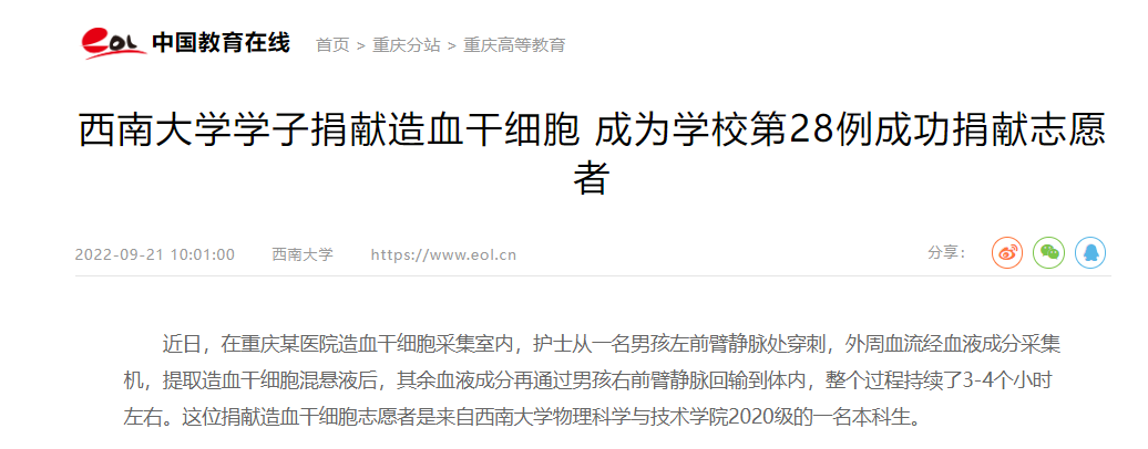 作为教育部直属,教育部、农业农村部、重庆市共建的重点综合大学,学校在注重学生专业能力培养的同时,也非常重视学生高尚道德品质的形塑。2014年中华骨髓库重庆分库西南大学工作站率先成立,成为全国唯一一个高校骨髓库工作站。据悉,截至2022年8月,重庆市造血干细胞成功配对200例。而西南大学先后共有28名志愿者成功捐献造血干细胞,在重庆市高校中切实起到了宣传推动和带头示范作用。
