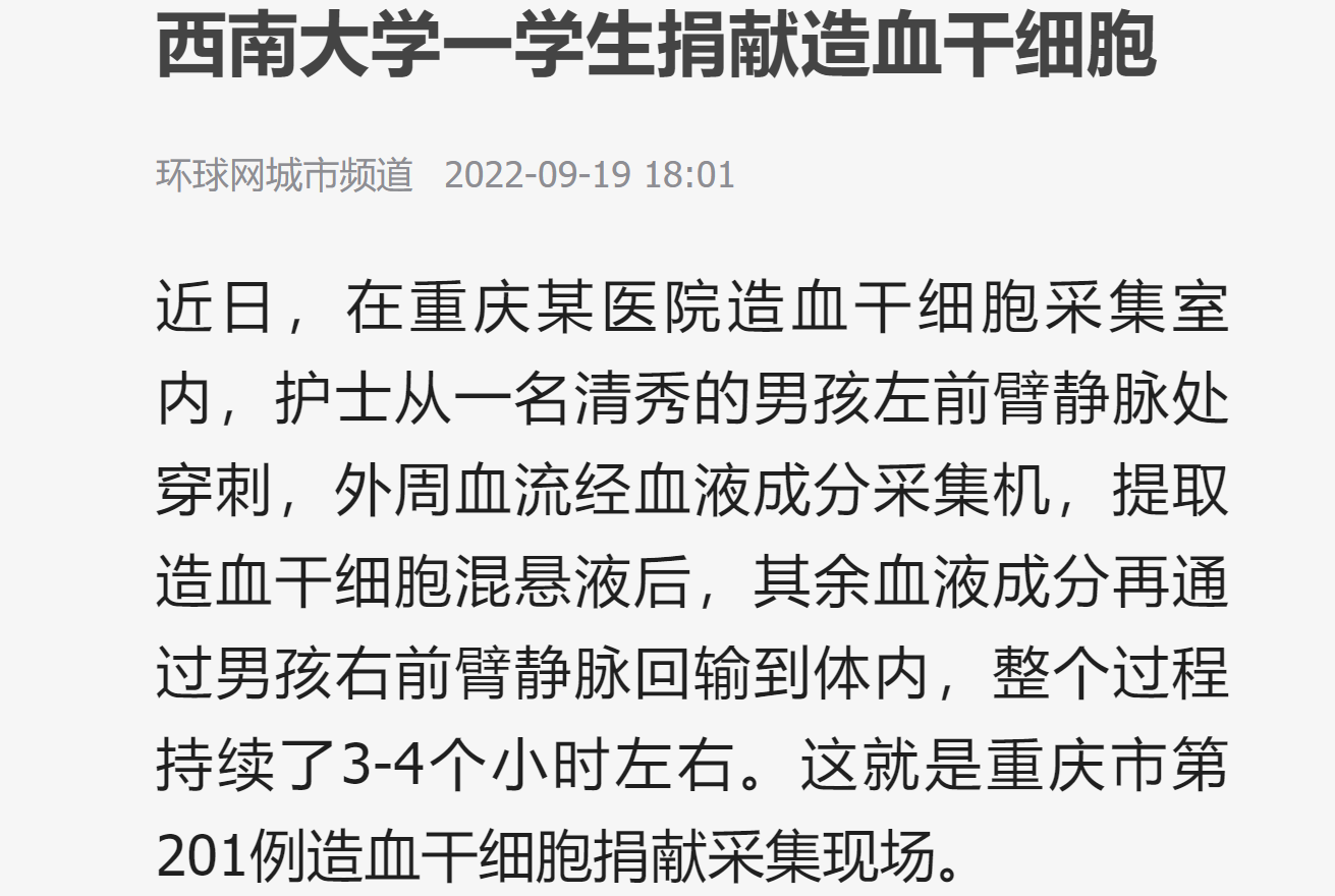 该同学是胜游体育(中国)官方在线20级的一名公费师范生,来自重庆渝北,为人踏实上进,热心公益事业,平时一直在积极参与学校组织的“西小兰”和“红帽子”等各种志愿服务活动。早在2020年10月,刚进入大学一个月的他就在西南大学红十字会倡议下,自愿参与了中国造血干细胞捐献者资料库采集,成为了一名光荣的造血干细胞捐献志愿者。